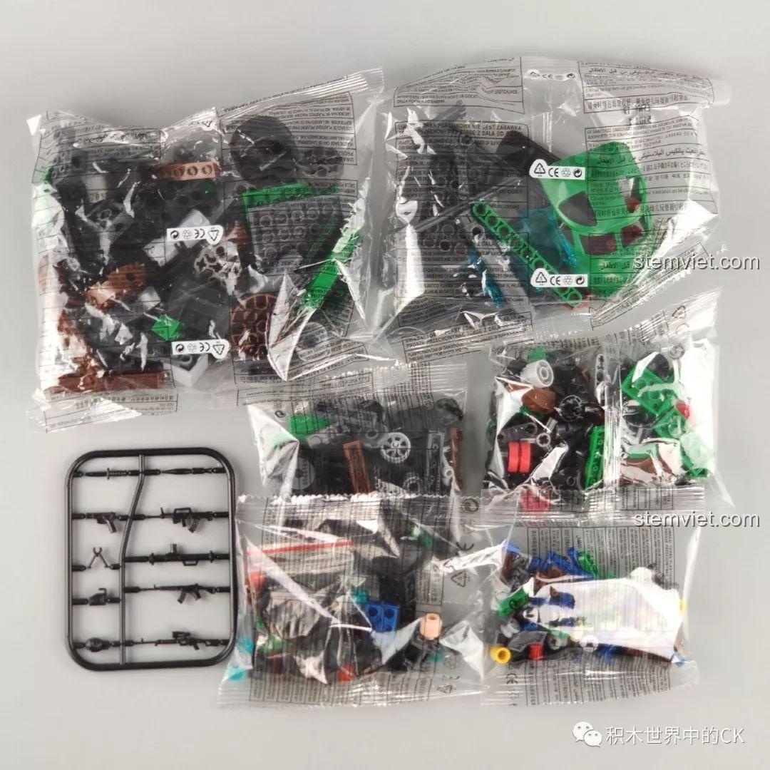 - Quà tặng kèm hấp dẫn: Tặng thêm bộ vũ khí hoặc dụng cụ cầm tay ngẫu nhiên cho 2 minifigure, giúp bé tăng cường sức mạnh cho đội quân của mình!