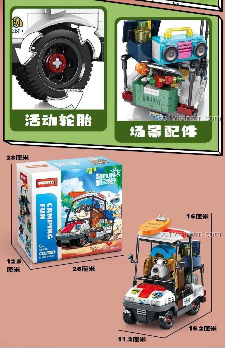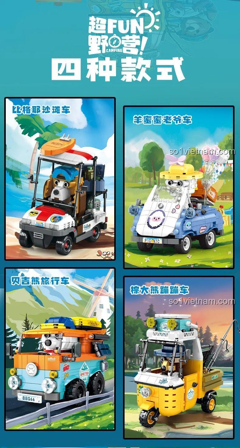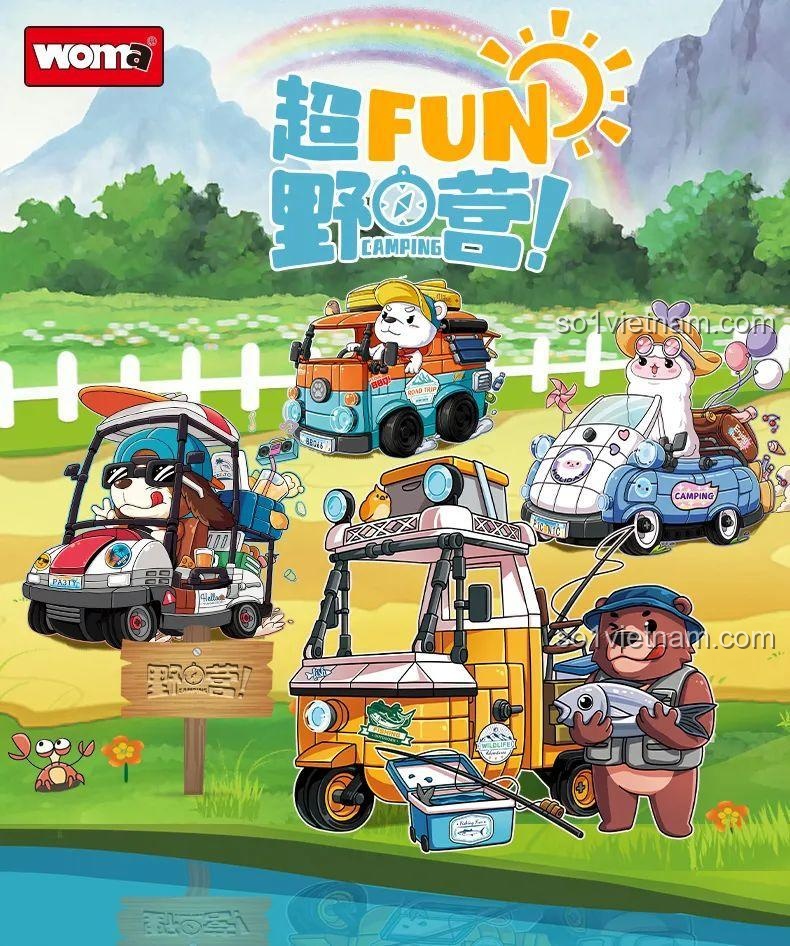 Bộ lắp ghép WOMA C0296 mang đến trải nghiệm lắp ráp đa dạng với khả năng biến hóa thành 4 mẫu xe khác nhau, tất cả đều xoay quanh chủ đề cắm trại vui nhộn: