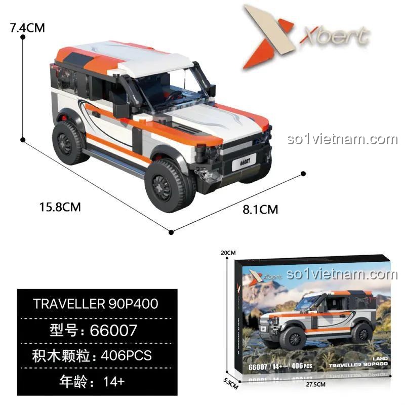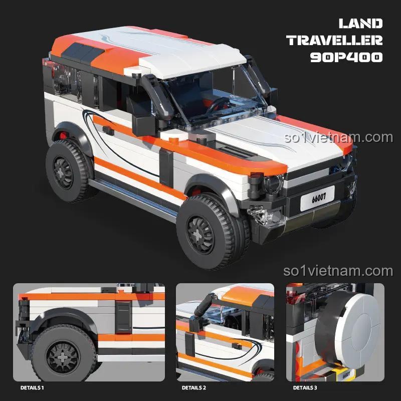 Bộ đồ chơi 66007 Xe Địa Hình LAND TRAVELLER 90P400 gây ấn tượng mạnh mẽ với thiết kế off-road hầm hố và đầy cá tính. Với màu sắc chủ đạo là trắng, cam, đen và xám, mô hình toát lên vẻ hiện đại nhưng không kém phần mạnh mẽ. Từng chi tiết được tái hiện tỉ mỉ, từ những đường nét góc cạnh của thân xe đến hệ thống bánh xe lớn, gai góc, sẵn sàng vượt qua mọi chướng ngại vật.