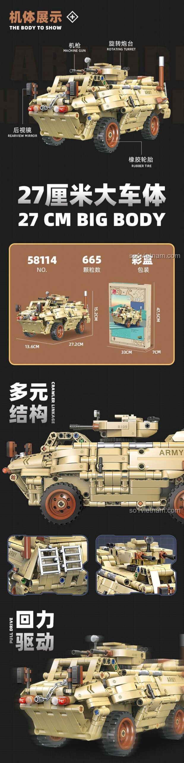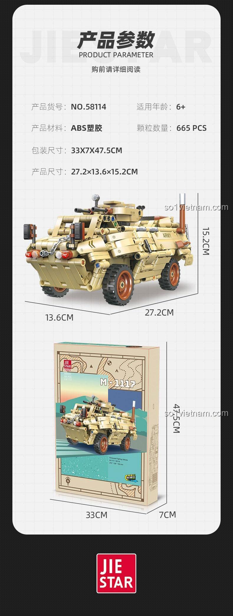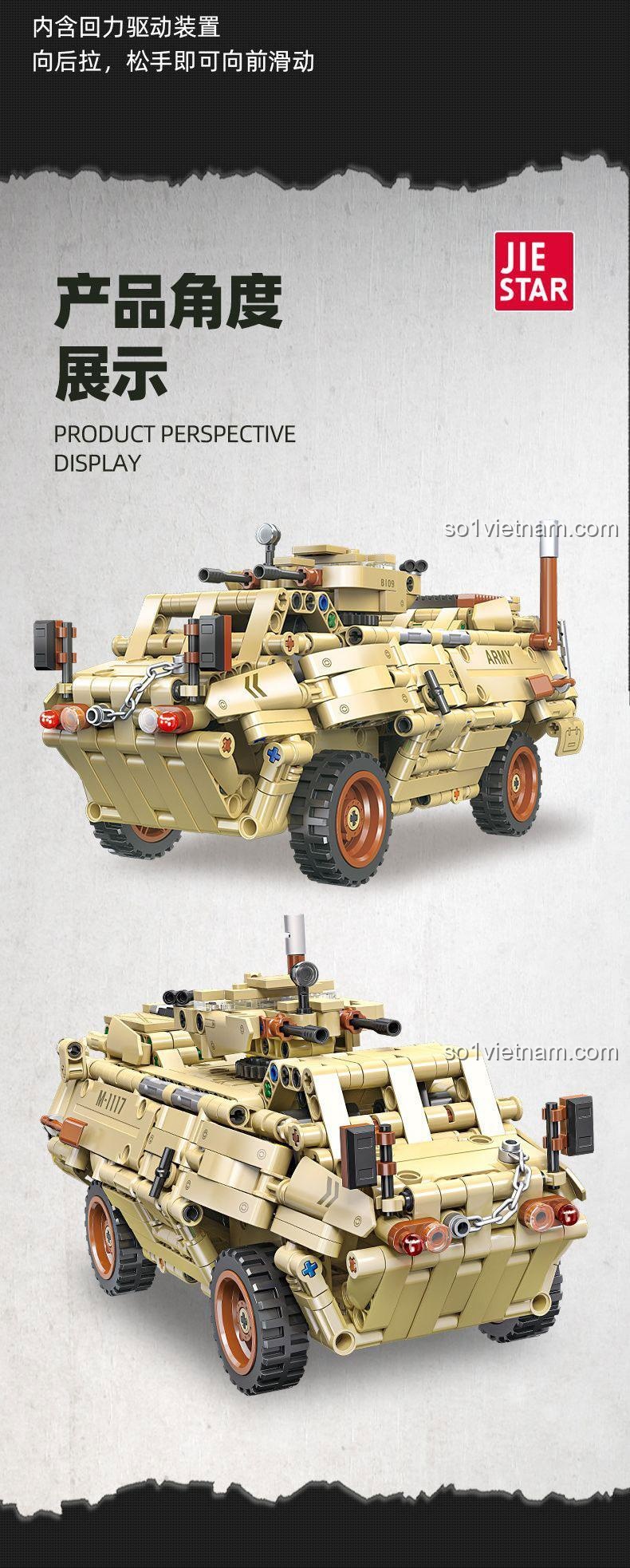 Bộ lắp ghép JIESTAR 58114 tái hiện sống động hình ảnh chiếc xe bọc thép này, cho phép các bé trai từ 6 tuổi trở lên có cơ hội tìm hiểu về lịch sử quân sự, khám phá các loại phương tiện chiến đấu và khơi dậy niềm đam mê với kỹ thuật. Khi lắp ráp, bé sẽ được hóa thân thành một kỹ sư quân sự tài ba, tự tay xây dựng nên một “chiến xa” uy lực, sẵn sàng cho mọi nhiệm vụ.