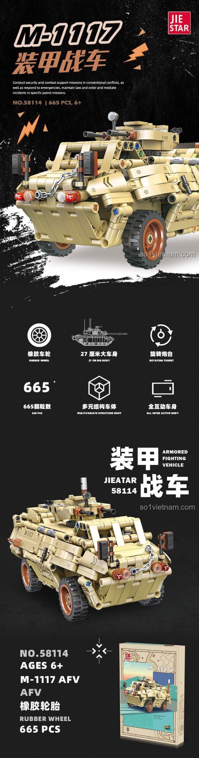 Xe Bọc Thép M1117 Guardian JIESTAR 58114 nổi bật với thiết kế chi tiết và chân thực, mang đến một mô hình lắp ráp đầy ấn tượng: