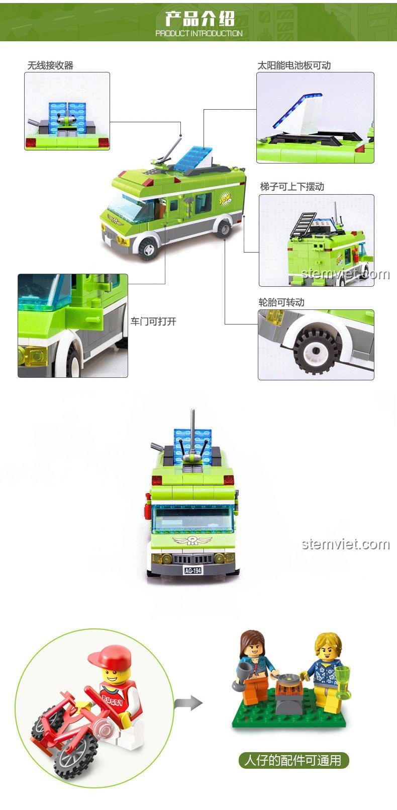 Với 380 chi tiết được chế tác tỉ mỉ từ nhựa ABS cao cấp, an toàn, bộ lắp ghép Enlighten 1120 cho phép bé tự tay xây dựng nên một chiếc xe cắm trại “Happy Trip” đầy màu sắc và tiện nghi. Chiếc xe nổi bật với tông màu xanh lá chủ đạo, thiết kế hiện đại cùng các chi tiết mô phỏng chân thực như tấm pin năng lượng mặt trời có thể điều chỉnh, thang leo tiện lợi, cửa xe mở được, và cả bộ thu tín hiệu không dây độc đáo. Đặc biệt, xe còn có khả năng mở rộng không gian bên hông, tạo nên một khu vực sinh hoạt ngoài trời lý tưởng cho gia đình nhỏ gồm 4 minifigure đi kèm.