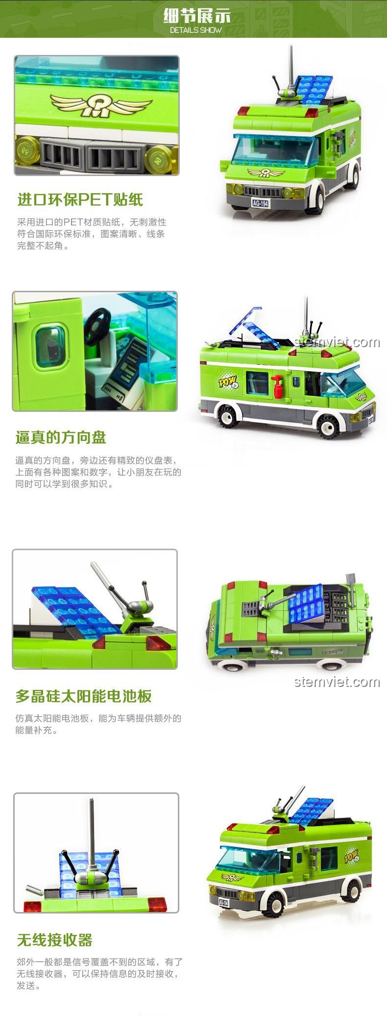 Bộ lắp ghép này có cửa xe mở được, bánh xe quay được, tấm pin năng lượng mặt trời có thể di chuyển, thang leo tiện lợi, bộ thu tín hiệu không dây và đặc biệt là khả năng mở rộng không gian bên hông xe.