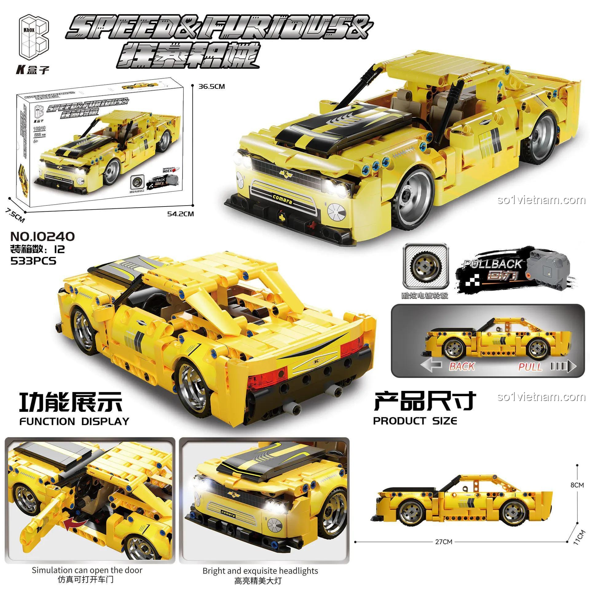 Điểm nhấn đặc biệt làm nên sức hút của bộ lắp ráp K盒子 10240 chính là động cơ kéo lùi mạnh mẽ. Chỉ cần kéo lùi xe và thả ra, bé sẽ được chứng kiến chiếc Camaro lao vun vút về phía trước, mang đến những màn rượt đuổi đầy kịch tính. Tính năng này không chỉ mang lại niềm vui bất tận mà còn giúp bé rèn luyện khả năng phối hợp tay mắt và kiểm soát lực.