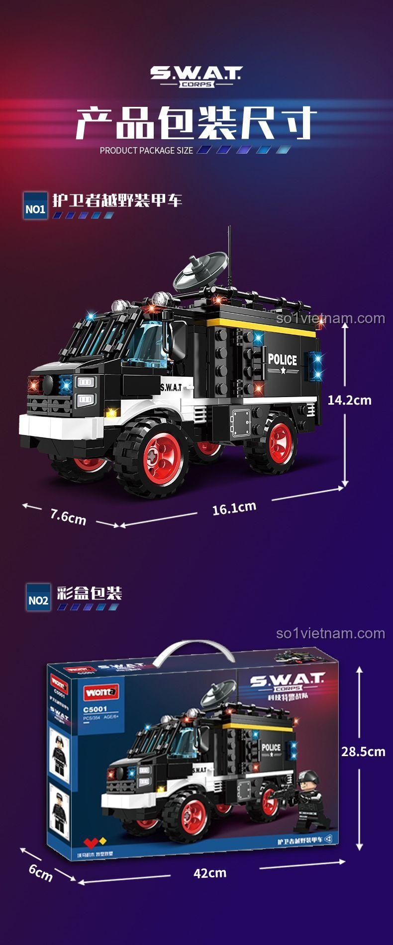 - Kích thước lý tưởng: Với kích thước mô hình sau lắp ráp là 16.1 x 7.6 x 14.2 cm, chiếc xe SWAT này vừa đủ lớn để bé dễ dàng cầm nắm, điều khiển và trưng bày, nhưng cũng không chiếm quá nhiều không gian.