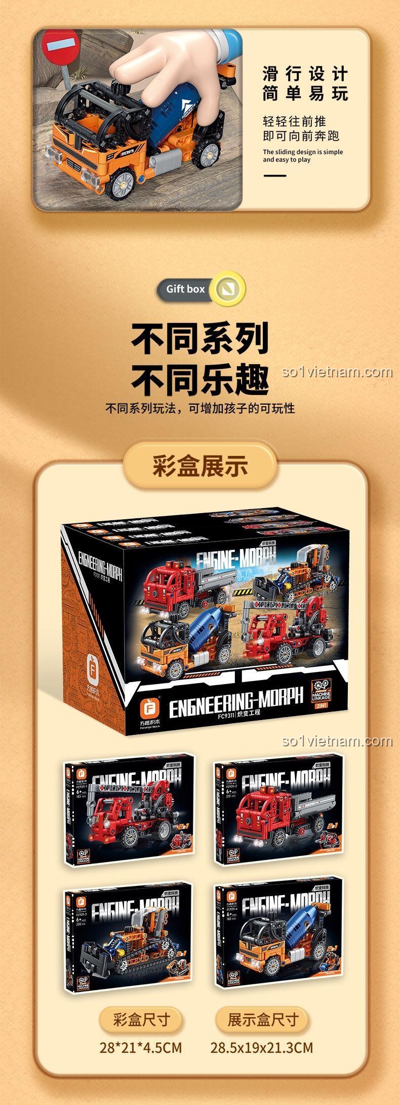 Bộ lắp ghép Forange FC9311 nổi bật với thiết kế tinh tế, tỉ mỉ đến từng chi tiết, tái hiện chân thực hình dáng và chức năng của các loại xe công trình. Các mảnh ghép được chế tác từ nhựa ABS cao cấp, đảm bảo độ bền, độ khít hoàn hảo và an toàn tuyệt đối cho trẻ nhỏ. Màu sắc chủ đạo đỏ, cam, xanh dương và đen kết hợp hài hòa, tạo nên vẻ ngoài mạnh mẽ, năng động và thu hút cho từng mô hình.