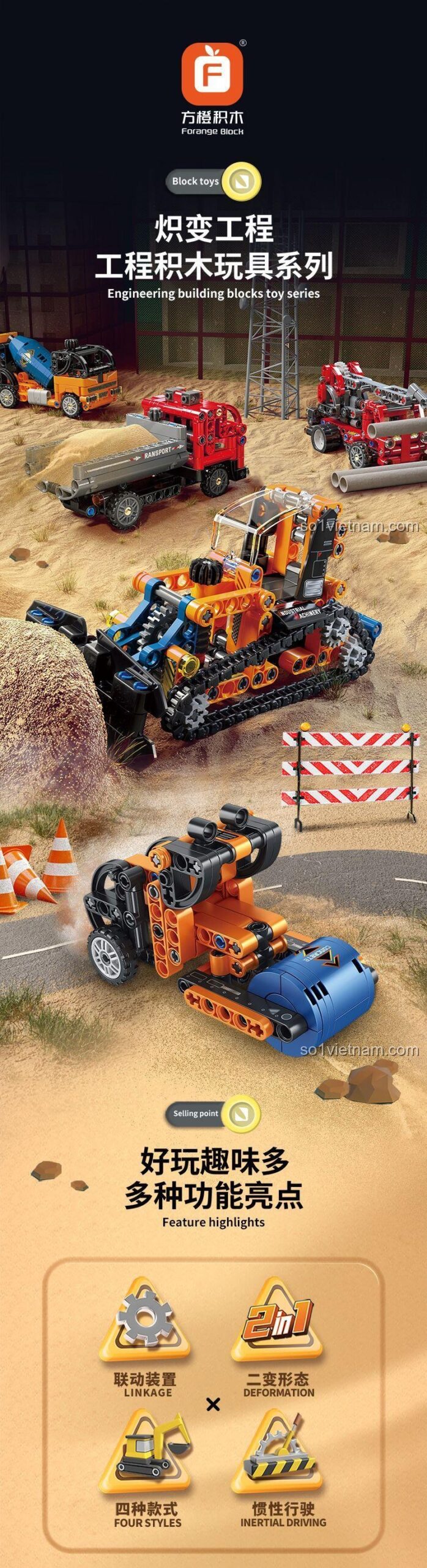Thế giới xe công trình luôn ẩn chứa những câu chuyện hấp dẫn về sự kiến tạo và phát triển. Từ những công trình đường bộ, tòa nhà chọc trời đến những dự án hạ tầng phức hán, những cỗ máy này chính là những người hùng thầm lặng, góp phần định hình nên thế giới chúng ta đang sống. Bộ lắp ghép Forange FC9311 lấy cảm hứng từ sự đa dạng và sức mạnh của các loại xe công trình, mang đến cho bé cơ hội tìm hiểu về chức năng và vai trò của từng loại xe.