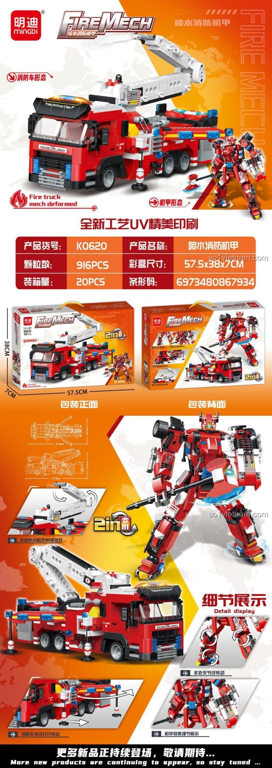 Chào mừng bố mẹ và các bé đến với thế giới lắp ghép đầy màu sắc cùng bộ đồ chơi Xe Cứu Hỏa Cơ Giáp K0620 từ thương hiệu uy tín 明迪minGDi! Với 916 mảnh ghép chi tiết, sản phẩm này không chỉ là một món đồ chơi, mà còn là một hành trình khám phá đầy thú vị, giúp bé phát triển toàn diện.
