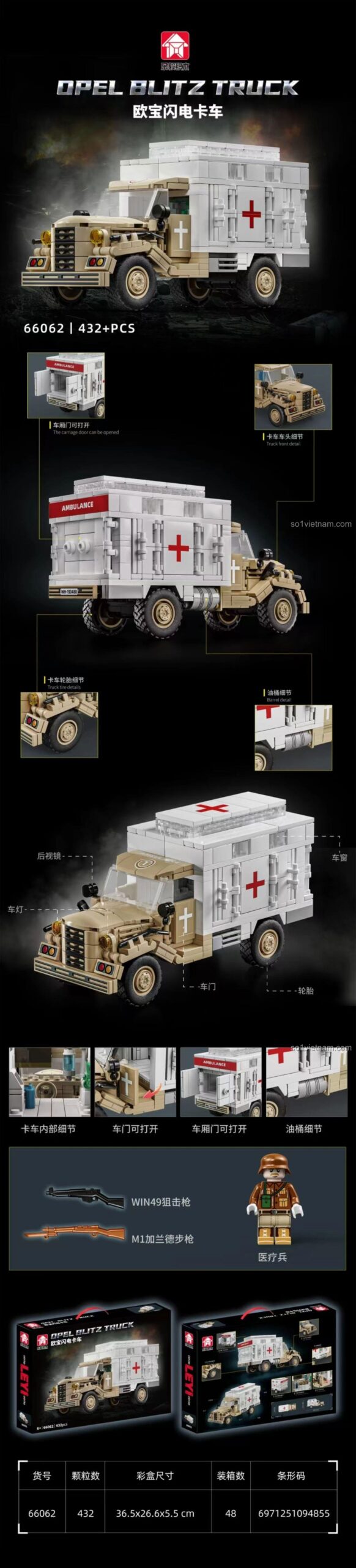 Xe cứu thương Opel Blitz, với thiết kế mạnh mẽ và đáng tin cậy, đã trở thành một biểu tượng của ngành hậu cần quân sự Đức trong Thế chiến II. Được sản xuất bởi Opel, chiếc xe này nổi bật với khả năng vận hành bền bỉ trên mọi địa hình, trở thành phương tiện không thể thiếu trong các chiến trường khốc liệt. Bộ lắp ghép LEVI 66062 không chỉ mang đến một mô hình xe đẹp mắt mà còn là cơ hội để bé tìm hiểu về vai trò quan trọng của các phương tiện y tế trong lịch sử, khơi gợi lòng biết ơn và sự tôn trọng đối với những người đã hy sinh vì hòa bình.