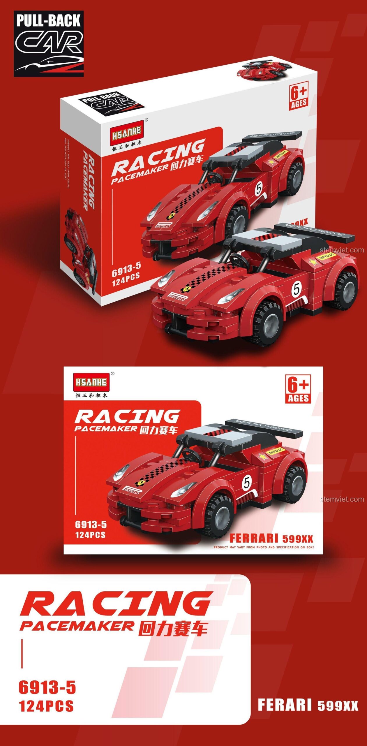 Có, bộ lắp ghép HSANHE 6913-5 Ferrari 599XX được thiết kế với 124 chi tiết, phù hợp với trẻ 6 tuổi trở lên, kèm theo hướng dẫn chi tiết giúp bé dễ dàng hoàn thành.