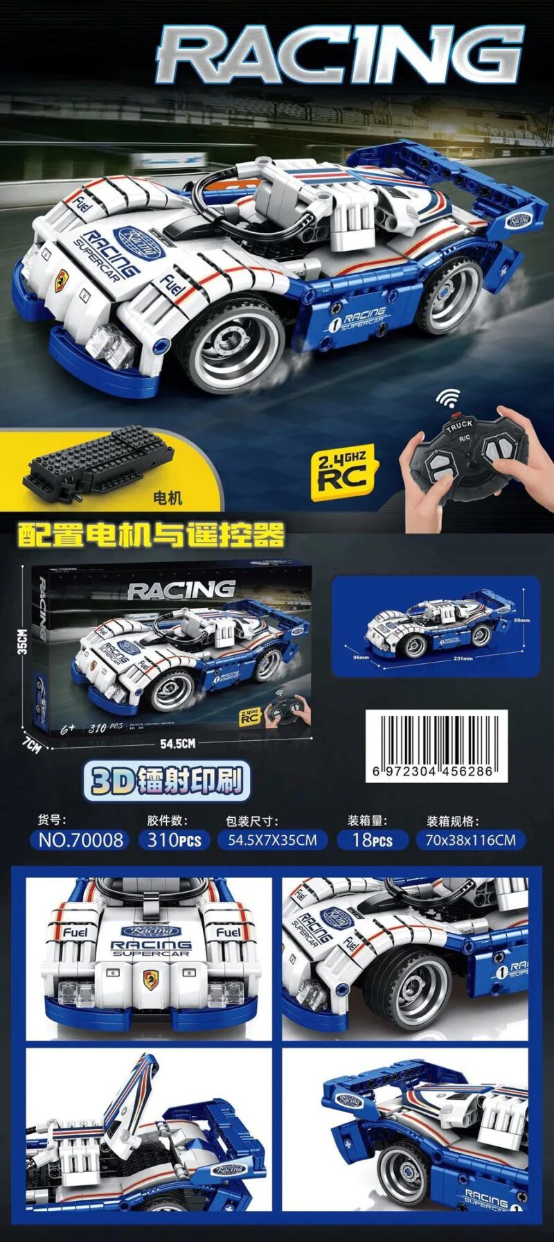 SEMBO 70008 gây ấn tượng mạnh mẽ với thiết kế mô phỏng chi tiết xe đua Porsche, mang đến một mô hình thu nhỏ đầy cuốn hút. Với tông màu chủ đạo là trắng, xanh dương, đỏ và đen, chiếc xe nổi bật với những đường nét thể thao, logo “RACING SUPERCAR” và “FUEL” được in sắc nét, tạo cảm giác chân thực như một chiếc xe đua thực thụ. Tỉ lệ mô hình được thiết kế vừa vặn, kích thước chi tiết (23.1cm x 9.6cm x 6.9cm) giúp bé dễ dàng cầm nắm và điều khiển. Các chi tiết như cánh gió thể thao, mâm xe độc đáo, và đặc biệt là cửa xe có thể mở, đều được chăm chút tỉ mỉ, thể hiện sự đầu tư trong thiết kế. Đây không chỉ là một bộ lắp ghép, mà còn là một tác phẩm trang trí độc đáo cho không gian của bé.