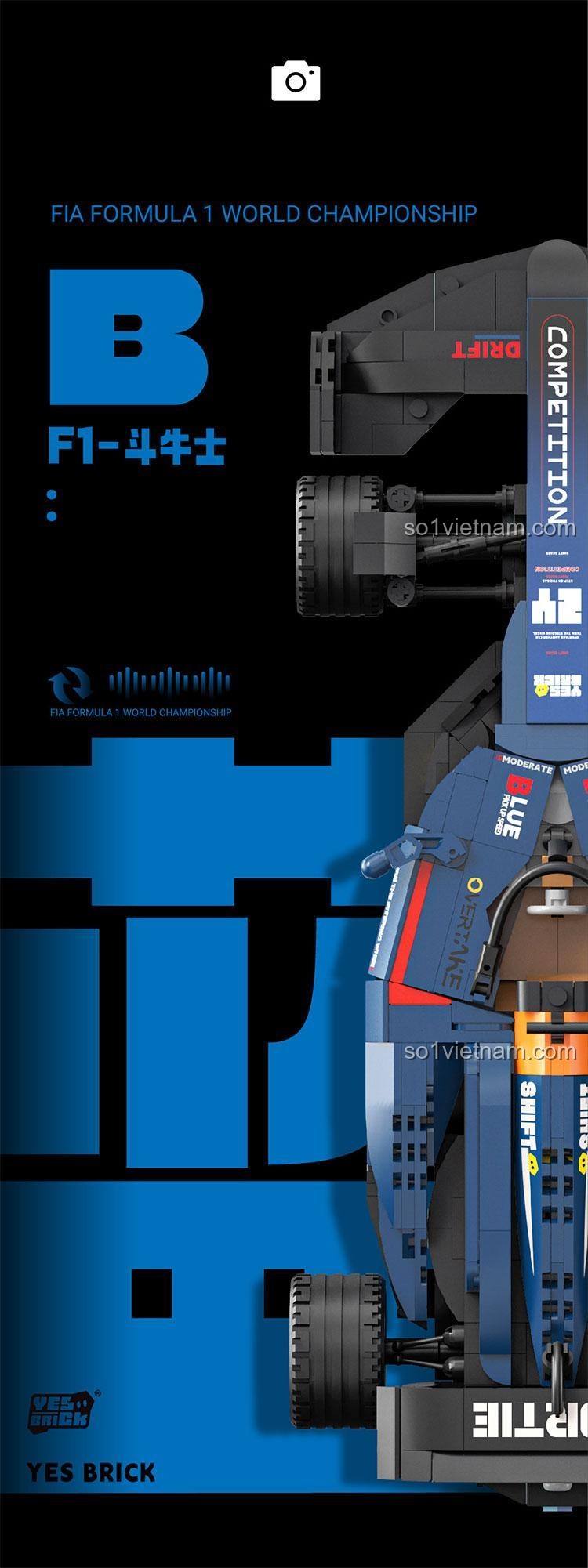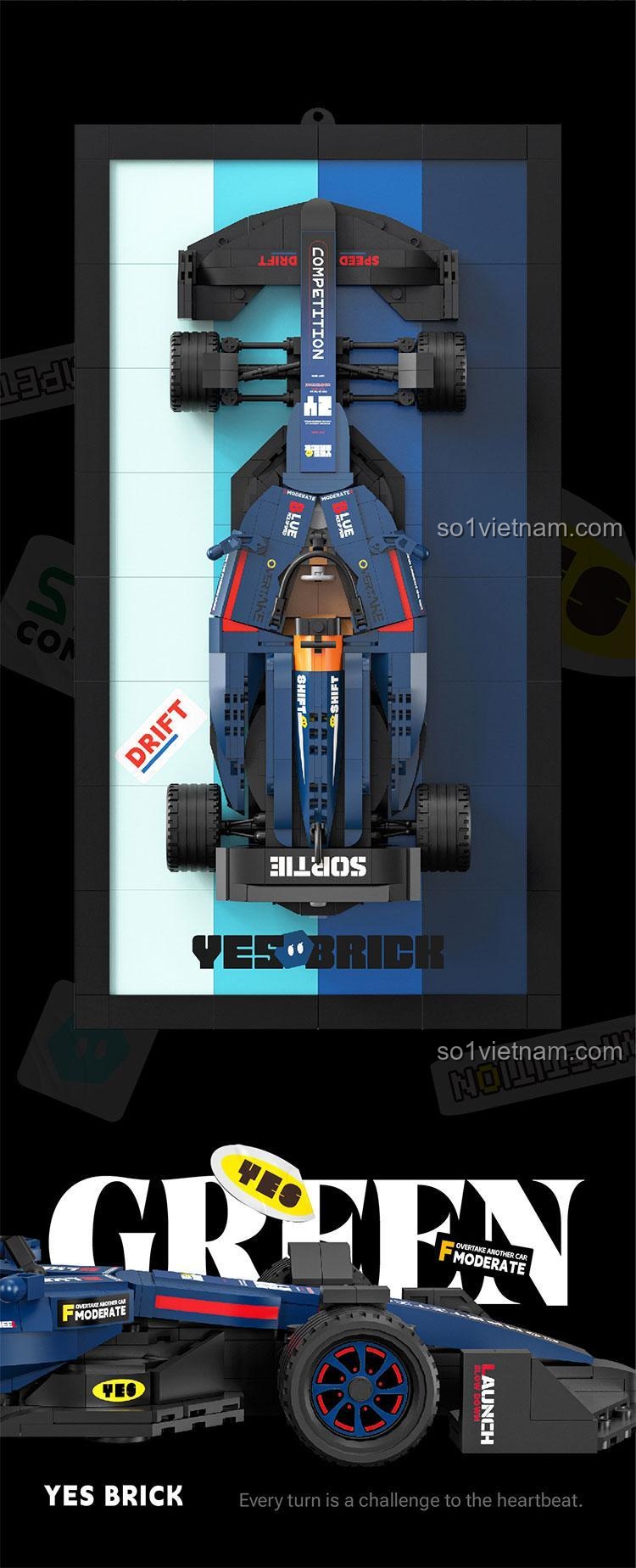 YES BRICK 2230 được thiết kế mô phỏng chân thực một chiếc xe đua F1 hiện đại, với những đường nét khí động học mạnh mẽ và tinh tế. Mỗi chi tiết đều được chăm chút tỉ mỉ, từ cánh gió trước và sau lớn giúp tăng lực ép xuống, đến hệ thống treo phức tạp và buồng lái chi tiết cho người lái. Màu sắc chủ đạo là xanh dương đậm mạnh mẽ, kết hợp với các điểm nhấn màu cam và đen tạo nên vẻ ngoài vô cùng ấn tượng và thu hút. Kích thước mô hình sau khi hoàn thiện (32 x 17 x 6 cm) vừa vặn để trưng bày trên bàn học hay kệ sách, trở thành một vật trang trí độc đáo.