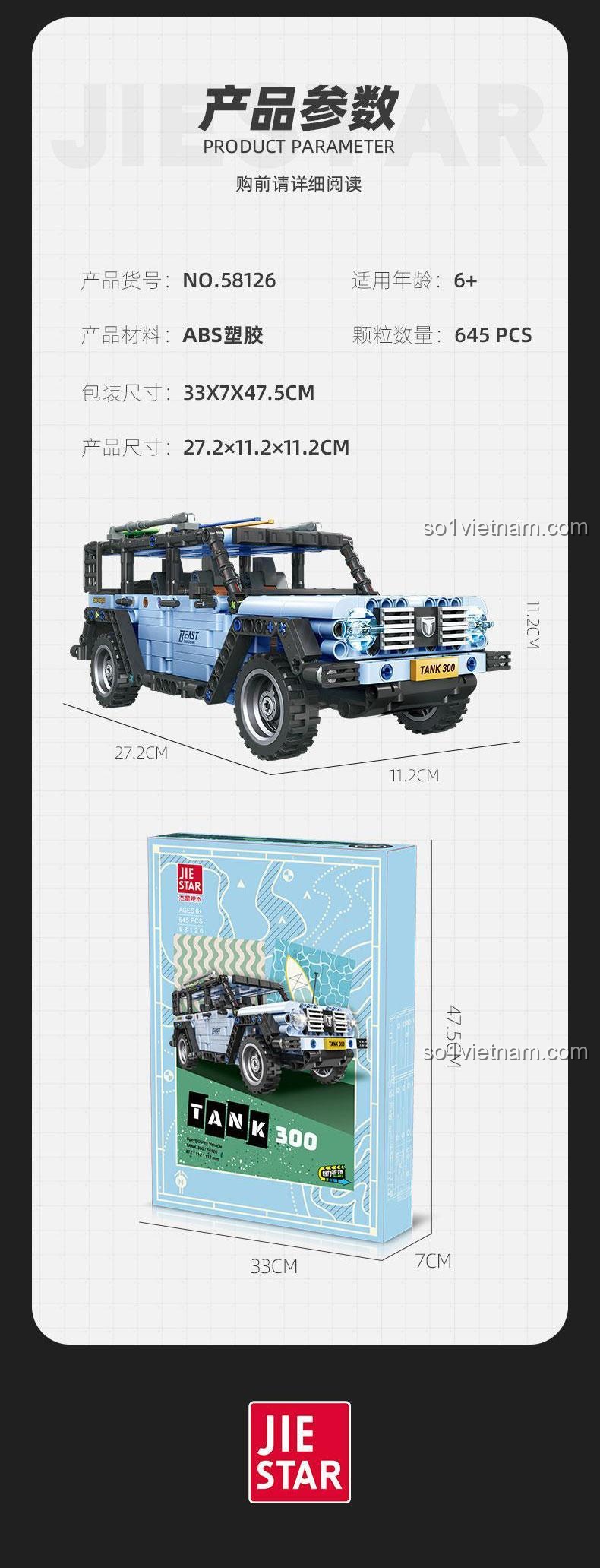 Bộ Lắp Ghép Xe Jeep Địa Hình Tank 300 JIESTAR 58126 nổi bật với thiết kế tỉ mỉ, tái hiện gần như hoàn hảo các đường nét của chiếc xe Jeep thực tế. Với kích thước mô hình ấn tượng (27.2 x 11.2 x 11.2 cm), bé sẽ có một mô hình xe Jeep đầy ấn tượng để trưng bày hoặc thỏa sức vui chơi.