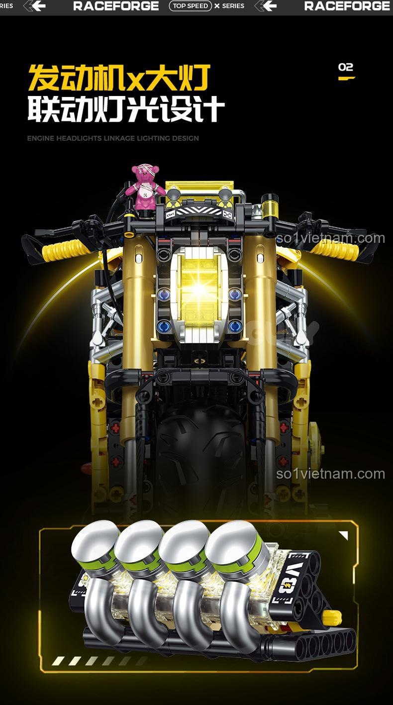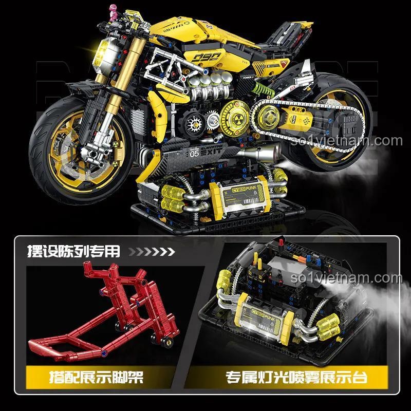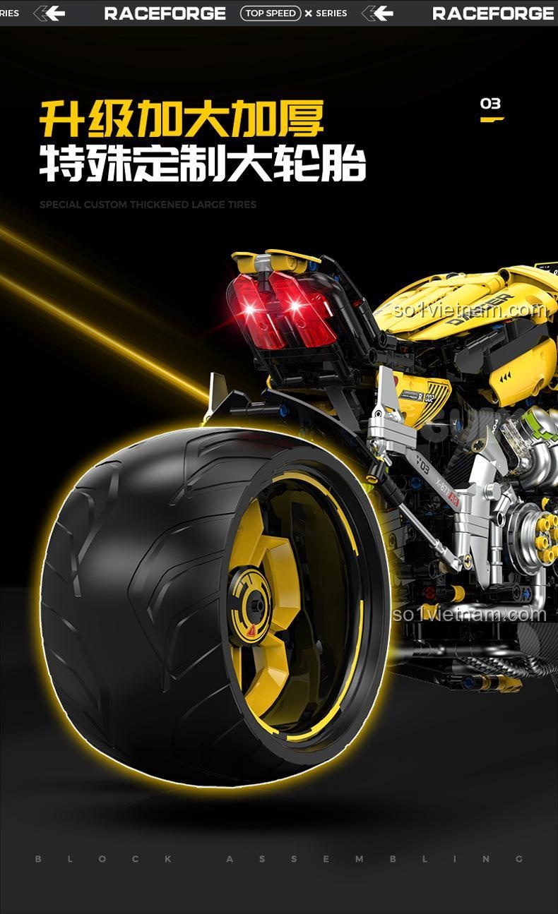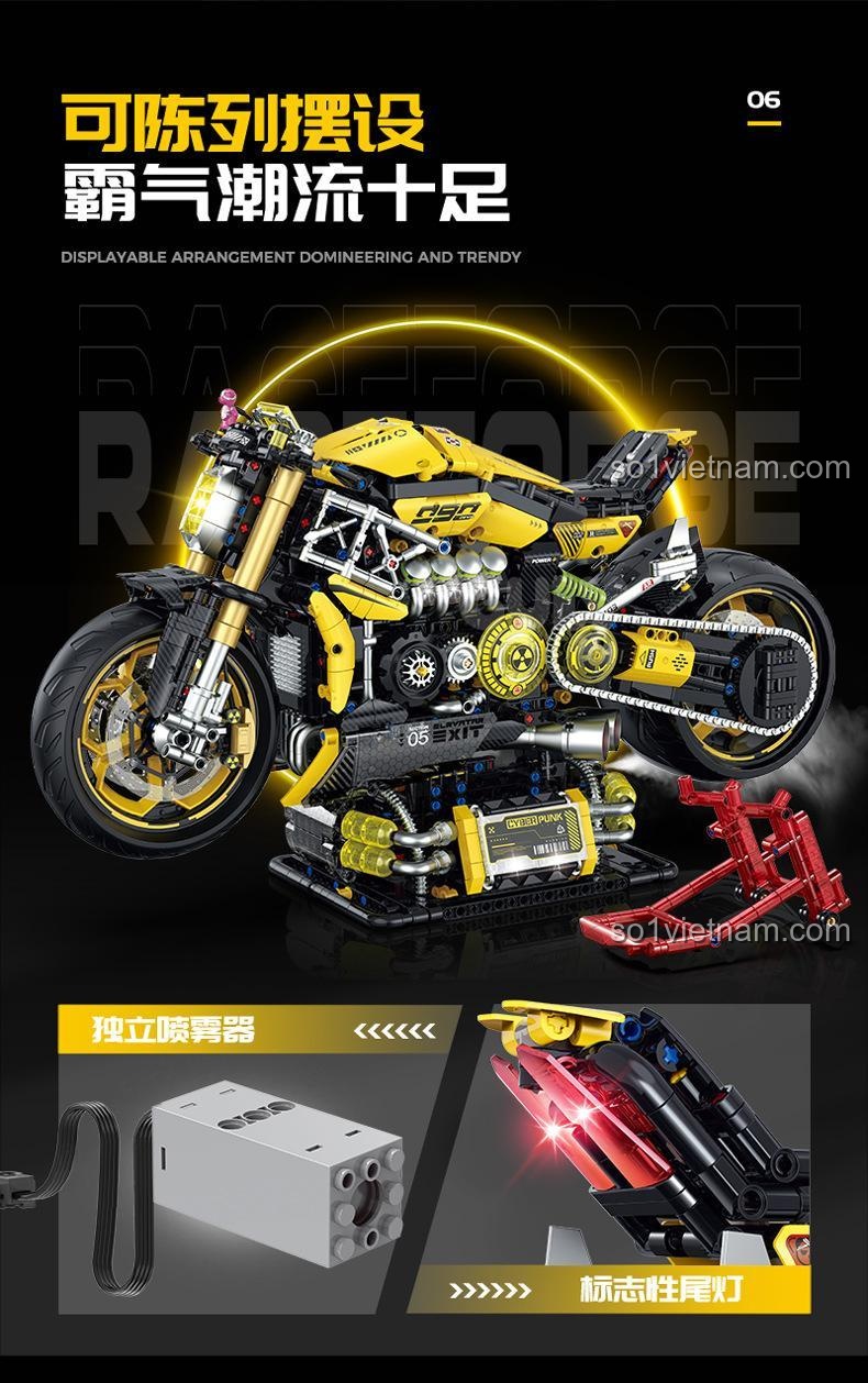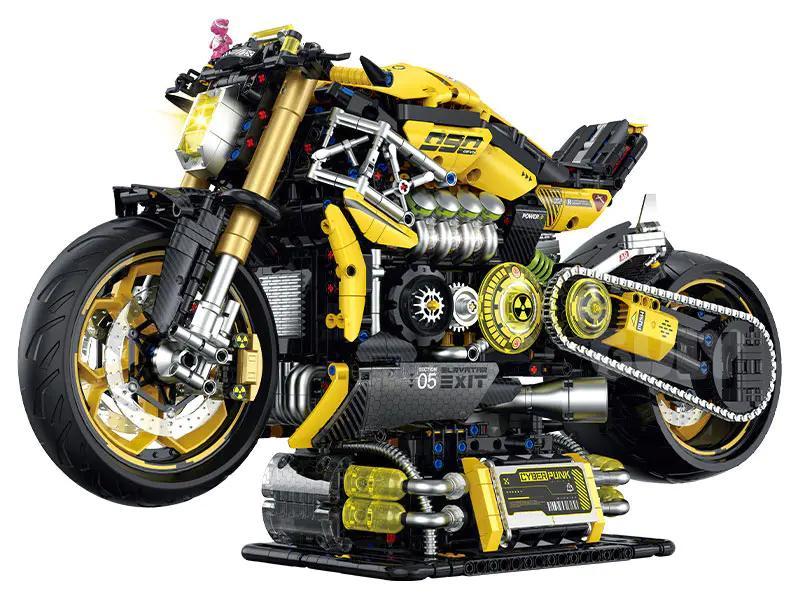Xe máy Cyberpunk Quái vật GULY 60519 nổi bật với thiết kế lấy cảm hứng từ phong cách cyberpunk, mang đến vẻ ngoài hầm hố, mạnh mẽ và đầy cuốn hút. Từng chi tiết nhỏ đều được chăm chút tỉ mỉ, từ hệ thống truyền động phức tạp, động cơ V8 giả lập, cho đến bộ bánh xe lớn, dày đặc biệt, tất cả tạo nên một mô hình xe máy đầy ấn tượng và sống động.