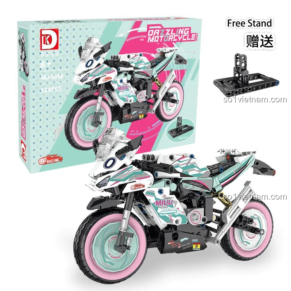 Bộ lắp ghép xe máy “歌姬机车” DK 5018 nổi bật với thiết kế “歌姬机车” độc đáo, mang đậm hơi thở của văn hóa anime. Sự kết hợp hài hòa giữa ba gam màu chủ đạo: trắng tinh khôi, hồng ngọt ngào và xanh dương mát mắt, tạo nên một tổng thể hài hòa và thu hút. Từng chi tiết nhỏ trên xe, từ phần đầu xe hầm hố, bình xăng góc cạnh đến bộ bánh xe và ống xả, đều được mô phỏng tỉ mỉ, mang đến một mô hình xe máy đầy sống động và chân thực.