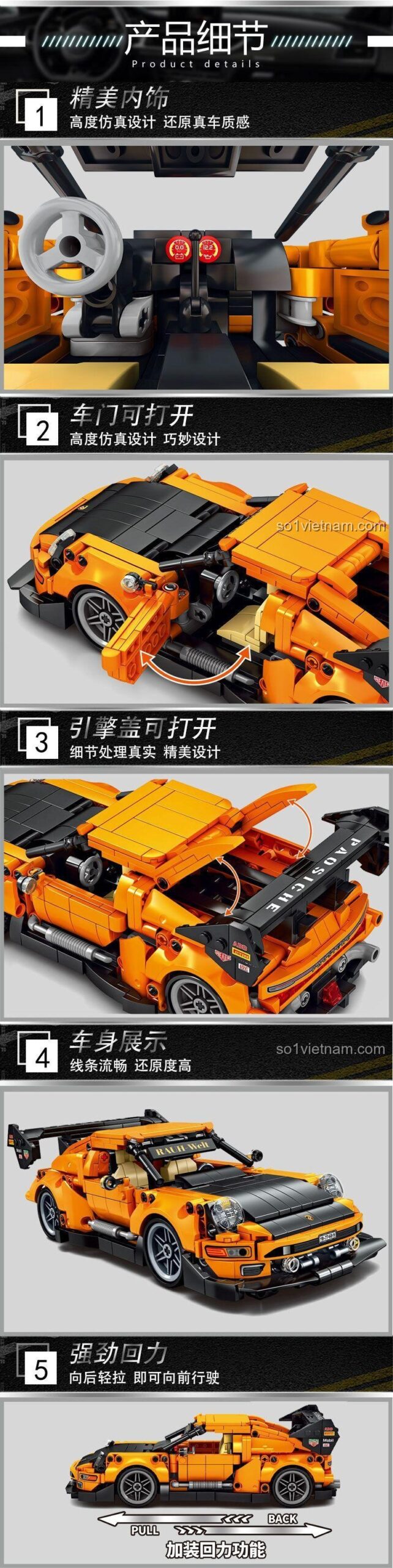 Điểm đặc biệt làm nên sức hút của bộ lắp ghép LEPIN BSJ-964 chính là chức năng hồi lực (pull-back). Chỉ cần kéo xe lùi lại và thả ra, chiếc Porsche 964 sẽ lao về phía trước với tốc độ ấn tượng, mang đến những giây phút giải trí đầy phấn khích.