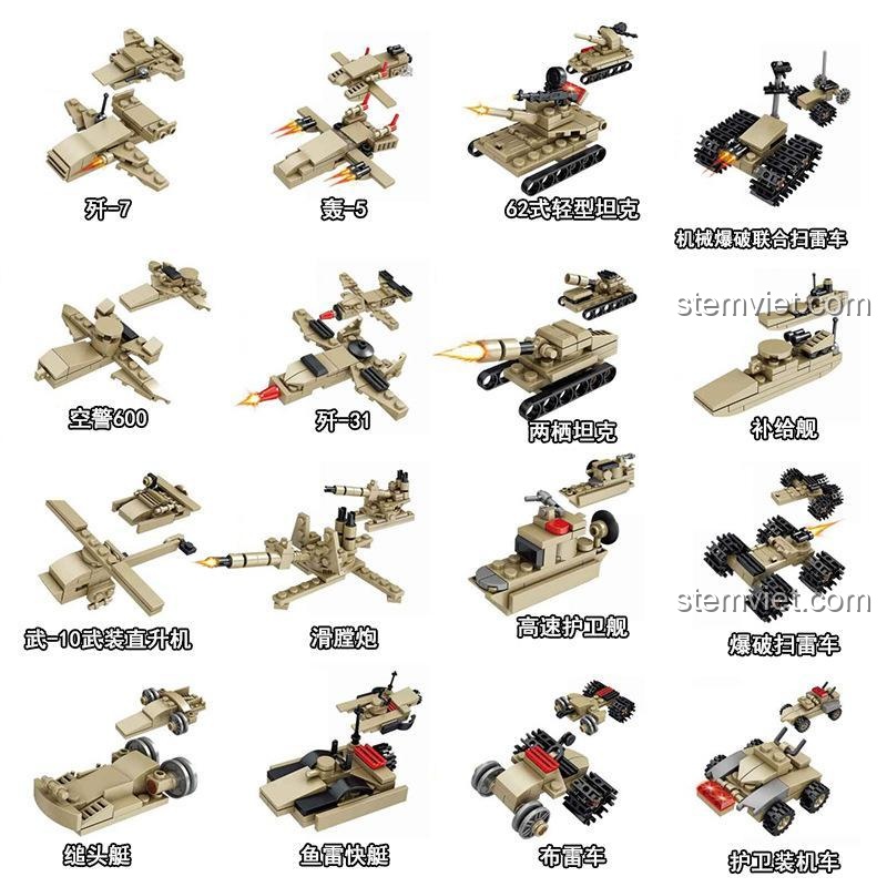 - Sáng tạo và trí tưởng tượng: Khả năng lắp ráp 16 mẫu khác nhau khuyến khích bé tự do sáng tạo, tạo ra những câu chuyện quân sự độc đáo.