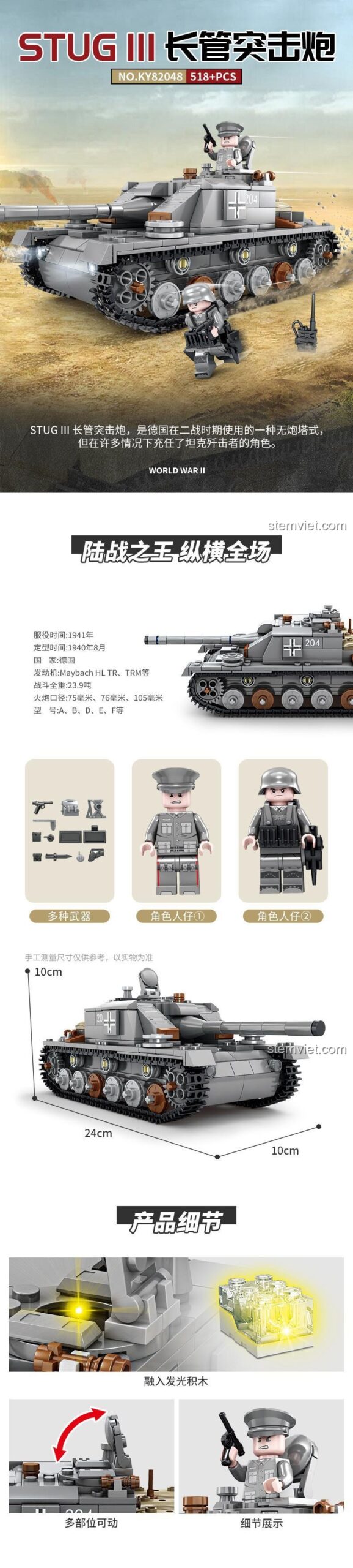 Bộ lắp ghép KAZI KY82048 tái hiện chân thực hình dáng và các chi tiết đặc trưng của xe tăng Stug III. Từ nòng pháo dài uy lực có thể điều chỉnh góc lên xuống, tháp pháo xoay linh hoạt, cho đến hệ thống bánh xích chuyển động mượt mà, mọi yếu tố đều được mô phỏng tỉ mỉ. Màu xám chủ đạo cùng các chi tiết trang trí mang đậm phong cách quân đội Đức tạo nên một mô hình xe tăng đầy ấn tượng và chân thực.