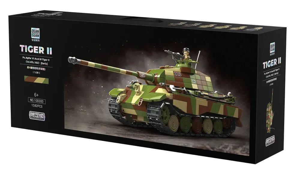 Bộ lắp ghép QUANGUAN 100300 nổi bật với thiết kế cực kỳ chi tiết và chân thực. Mô hình xe tăng Tiger II phiên bản đầu được tái hiện sống động với tỉ lệ 1:28, mang đến kích thước ấn tượng: dài 36.1cm, rộng 13.4cm và cao 14.5cm. Từng bộ phận, từ hệ thống bánh xích, tháp pháo, nòng pháo cho đến các chi tiết nhỏ như cửa sổ quan sát, đèn pha, đều được mô phỏng tỉ mỉ.