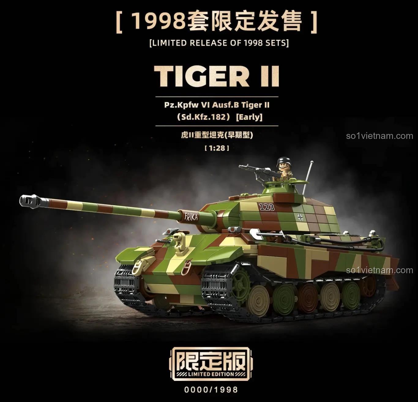 Chào mừng các nhà chỉ huy tương lai và những người đam mê lịch sử quân sự! Hôm nay, chúng ta sẽ cùng nhau khám phá một kiệt tác mô hình lắp ráp: Bộ Lắp Ghép Xe Tăng Tiger II (Phiên Bản Đầu) QUANGUAN 100300. Với 1582 mảnh ghép chi tiết, tỉ lệ 1:28 chân thực, đây không chỉ là một món đồ chơi mà còn là một tác phẩm nghệ thuật tái hiện lại một trong những xe tăng mạnh mẽ nhất lịch sử Thế chiến II.