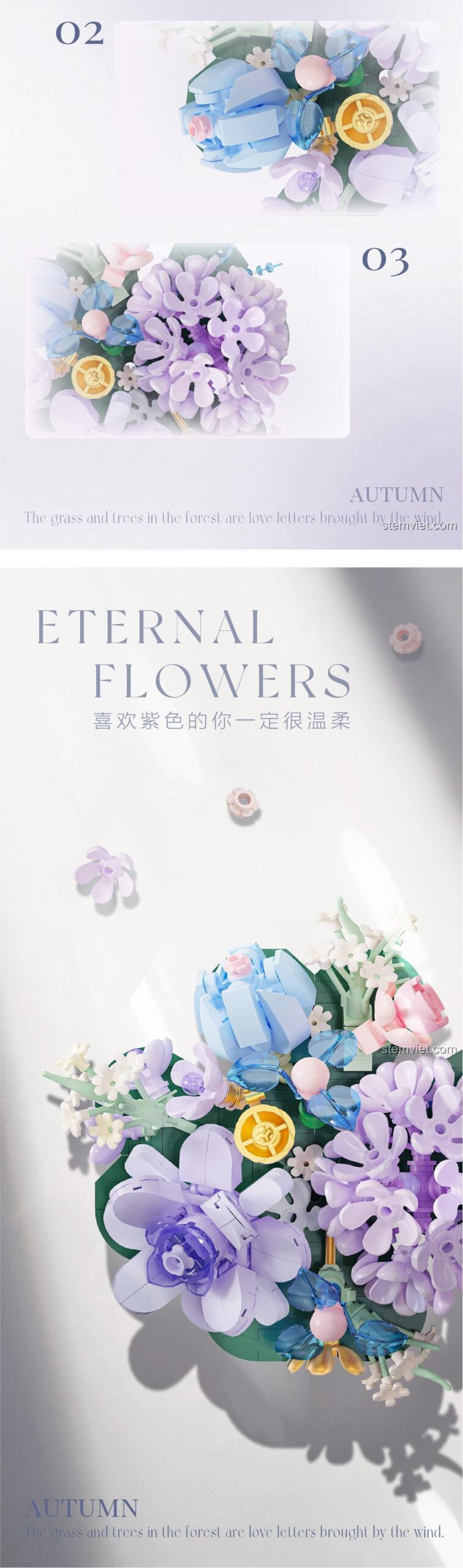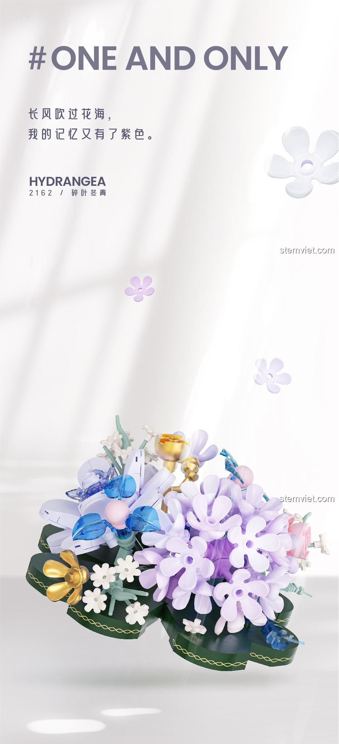 Màu sắc chủ đạo của mô hình là sự kết hợp hài hòa giữa Tím mộng mơ, Xanh dương dịu mát, Xanh lá tươi tắn và Trắng tinh khôi, tạo nên một tổng thể sống động và bắt mắt. Từng cánh hoa, chiếc lá đều được thiết kế với độ chính xác cao, đảm bảo khi lắp ráp sẽ tạo thành một khối vững chắc và đẹp mắt. Đây không chỉ là một món đồ chơi mà còn là một tác phẩm điêu khắc mini, thể hiện sự tinh xảo trong thiết kế và khả năng tái tạo vẻ đẹp tự nhiên một cách ấn tượng.