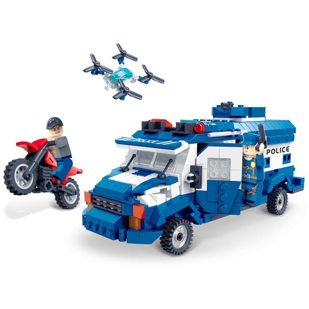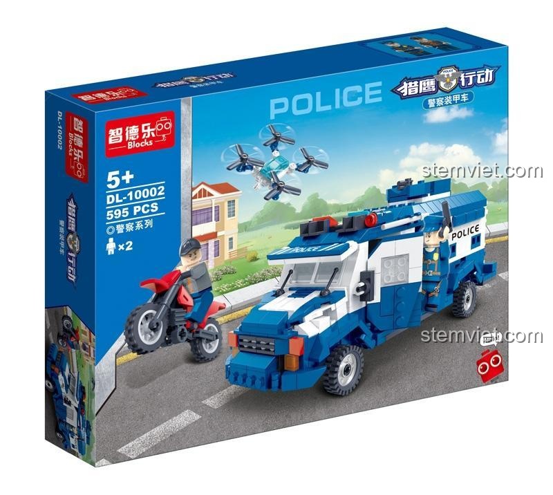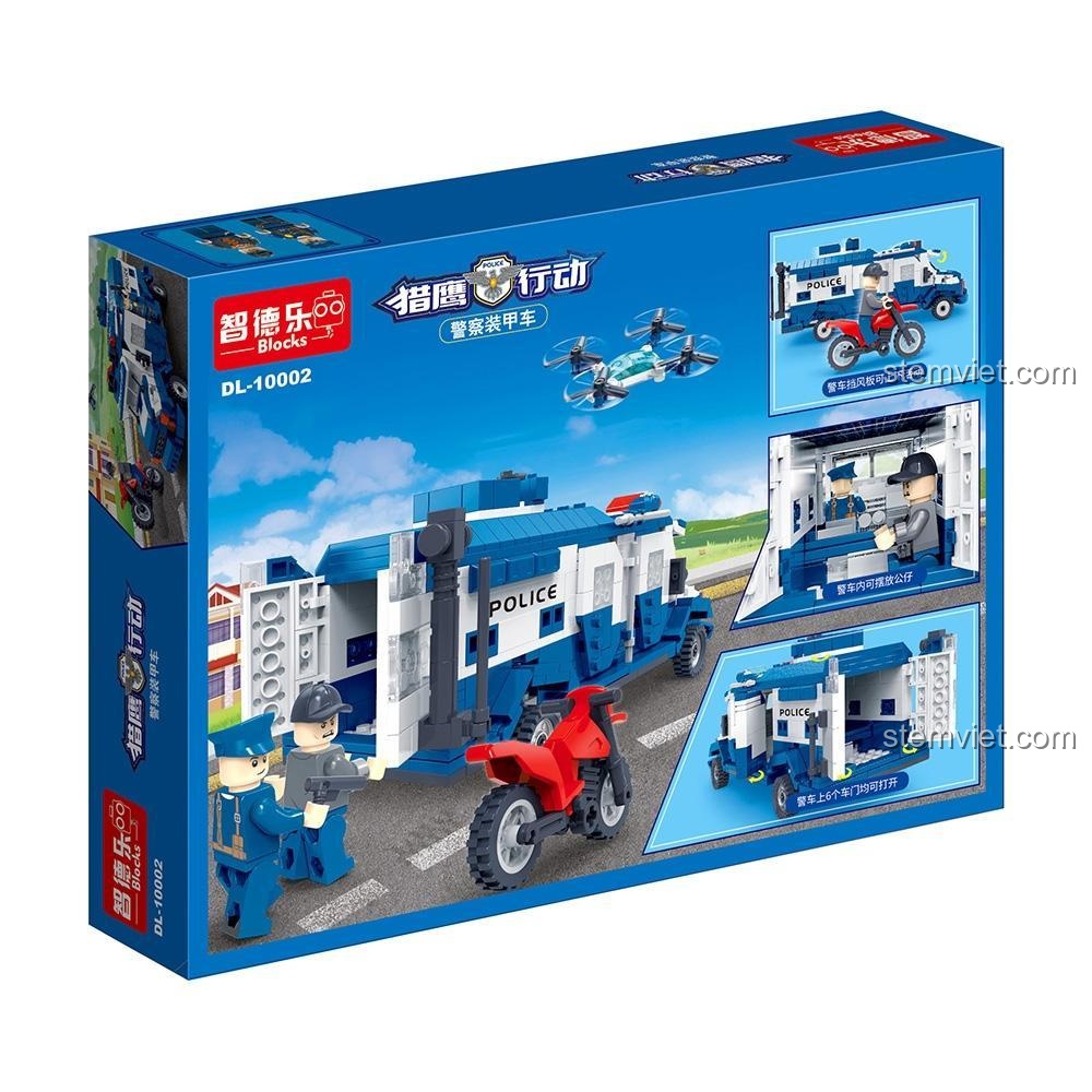 Không chỉ có xe bọc thép, bộ đồ chơi lắp ráp DL10002 còn đi kèm một xe mô tô cảnh sát nhỏ gọn và một máy bay không người lái (drone) linh hoạt, bổ sung thêm nhiều kịch bản chơi hấp dẫn. Từng chi tiết của đồ chơi mô hình 10002, từ đèn pha, còi hú (mô phỏng), đến các đường nét góc cạnh của thân xe, đều được tái hiện một cách chính xác, mang lại trải nghiệm lắp ráp và chơi chân thực nhất. Đây là một bộ lắp ghép Xe Cảnh Sát Đặc Nhiệm hoàn hảo để bé khám phá thế giới phương tiện chuyên dụng.