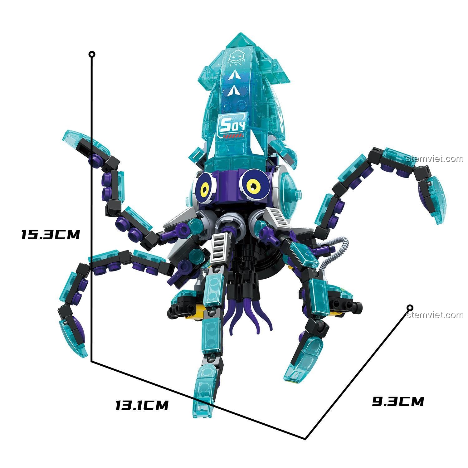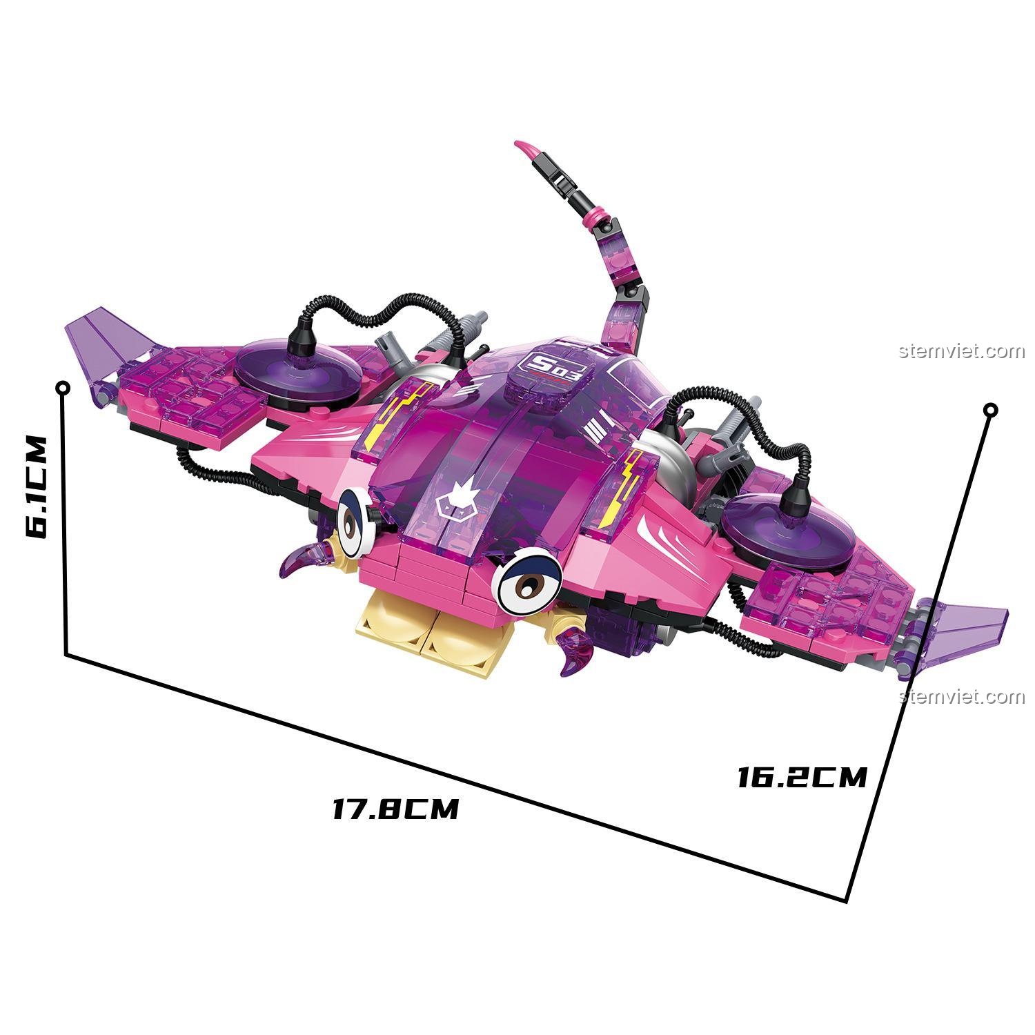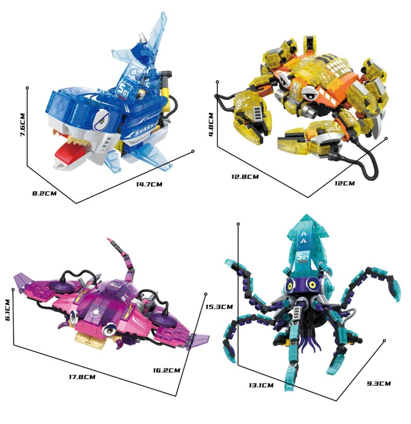 Bộ đồ chơi này cho phép bé lắp ráp thành 4 mô hình sinh vật biển sâu khác nhau: Cá mập, Cua, Cá đuối và Mực. Mỗi mô hình mang một vẻ đẹp và đặc điểm riêng, giúp bé thỏa sức sáng tạo và khám phá.