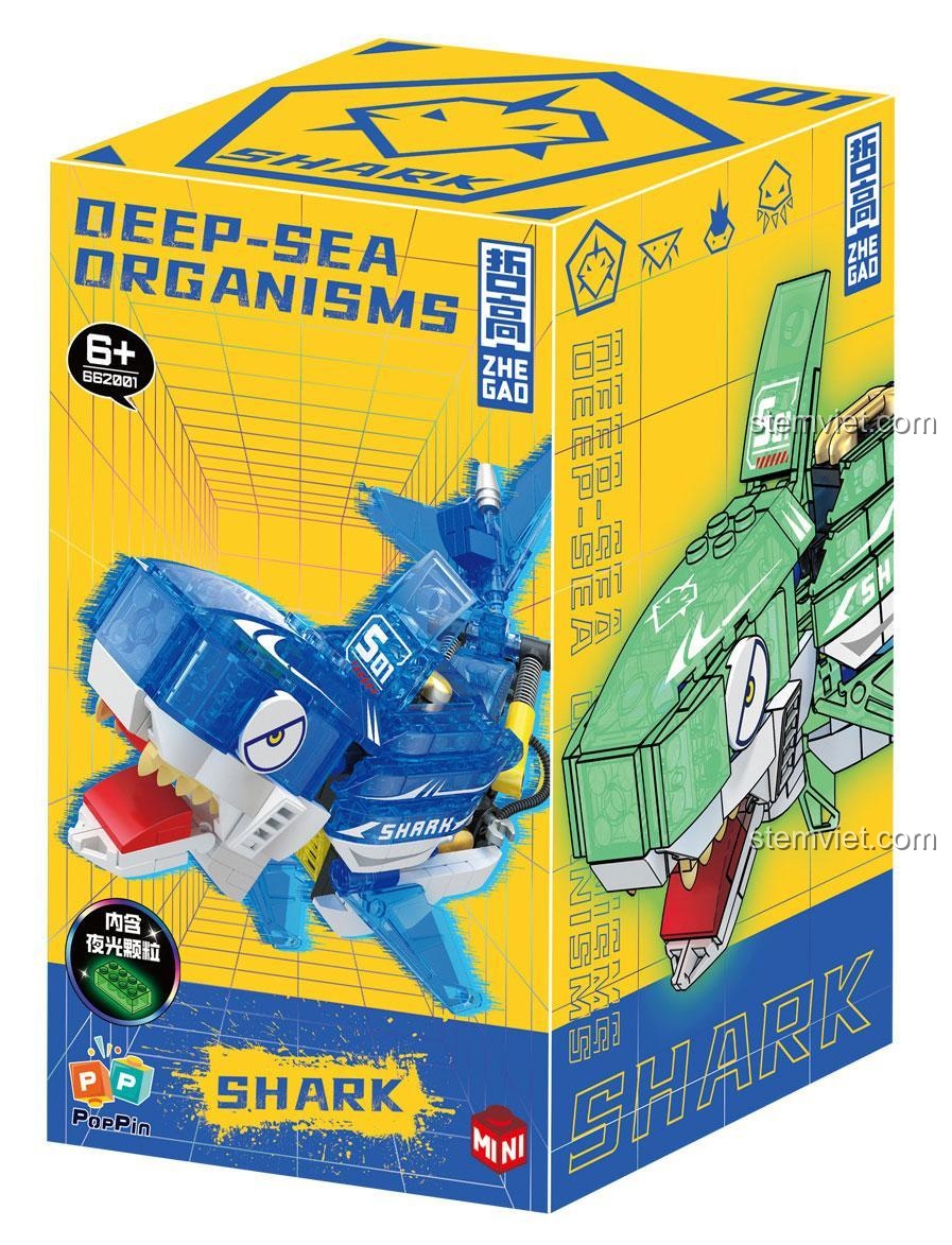 Bộ lắp ghép Zhe Gao 662001 nổi bật với thiết kế tinh xảo và màu sắc sống động, tái hiện chân thực 4 loài sinh vật biển sâu: Cá mập dũng mãnh, Cua lanh lợi, Cá đuối duyên dáng và Mực bí ẩn. Mỗi mô hình đều được chăm chút tỉ mỉ từng chi tiết, từ vây cá mập, càng cua, đến đôi mắt to tròn của mực, mang đến trải nghiệm lắp ráp và trưng bày ấn tượng. Đặc biệt, điểm nhấn nổi bật của bộ đồ chơi này chính là khả năng Phát Sáng Trong Bóng Tối, biến những sinh vật này trở nên lung linh, huyền ảo như thật khi màn đêm buông xuống. Với kích thước mô hình tối đa là 17.8 cm chiều dài, 16.2 cm chiều rộng và 15.3 cm chiều cao, các mô hình này đủ lớn để bé dễ dàng thao tác nhưng vẫn gọn gàng để trưng bày. Màu sắc chủ đạo như xanh dương, cam, hồng, xanh lơ, tím, đen và xám được phối hợp hài hòa, tạo nên một bức tranh đại dương đầy màu sắc và cuốn hút.