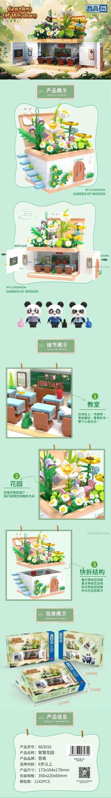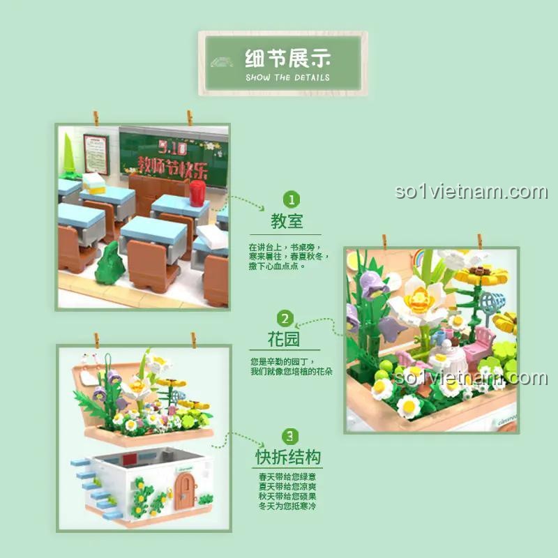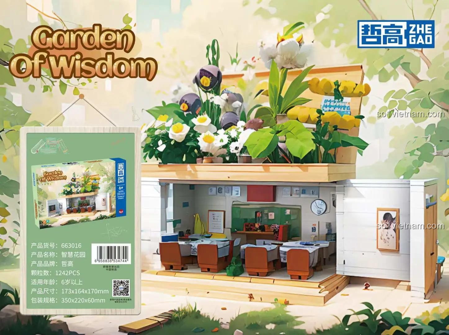 Bộ lắp ghép ZHEGAO 663016 Vườn Trí Tuệ tái hiện một không gian lớp học đầy đủ tiện nghi, từ bàn ghế cho học sinh, bảng đen với những dòng chữ ý nghĩa, đến các vật dụng trang trí sinh động. Phía trên là một khu vườn xanh mướt với muôn vàn loài hoa khoe sắc, tạo nên một bức tranh thiên nhiên tươi đẹp ngay trong phòng bé. Sự kết hợp hài hòa giữa kiến trúc và thiên nhiên mang đến cảm giác thư thái, khơi gợi trí tưởng tượng phong phú cho trẻ.