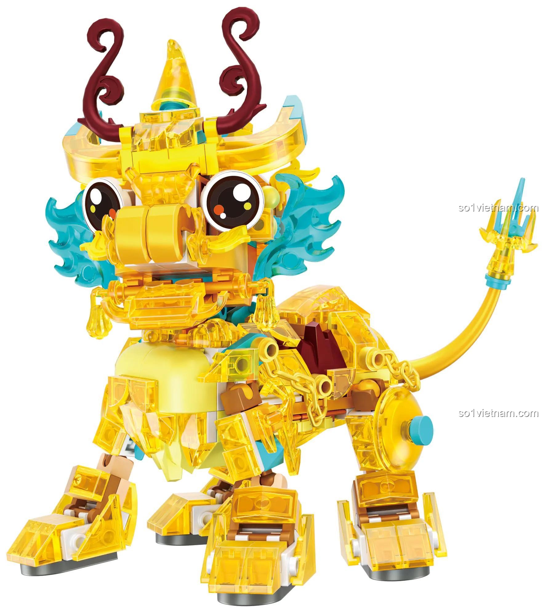 Kỳ Lân, một trong Tứ Linh của phương Đông, được tái hiện trong bộ lắp ghép với sắc vàng rực rỡ, tượng trưng cho sự cao quý và may mắn. Mô hình Kỳ Lân sở hữu vẻ ngoài uy dũng nhưng không kém phần hiền hòa, với bờm sư tử, sừng rồng và thân hình mạnh mẽ. Các chi tiết nhỏ như đôi mắt long lanh và chiếc đuôi dài được chăm chút kỹ lưỡng, tạo nên một tổng thể hài hòa và ấn tượng.