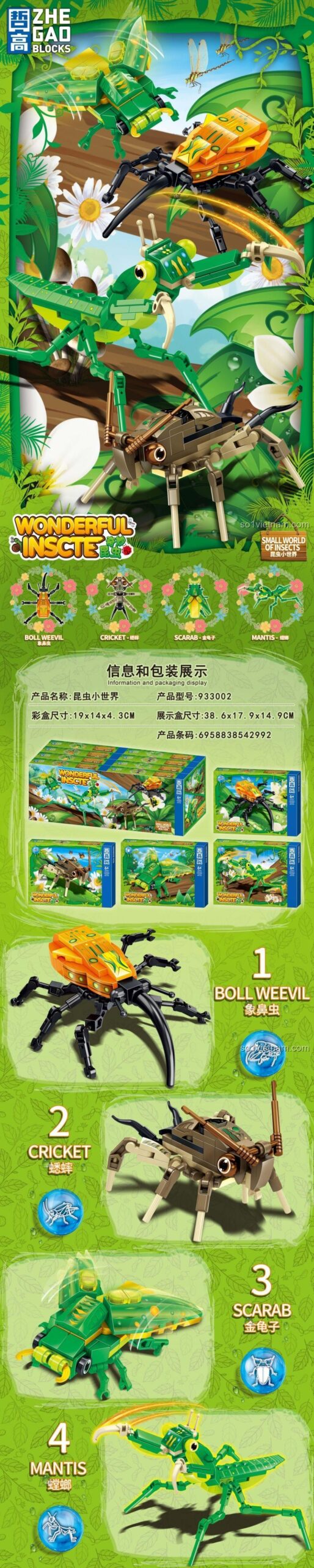 Bộ xếp hình Dế ZHEGAO 933002 cho phép bé lắp ráp được 4 mẫu côn trùng khác nhau bao gồm Bọ Vòi Voi, Dế, Bọ Hung và Bọ Ngựa. Mỗi mẫu đều có thiết kế độc đáo và chi tiết.