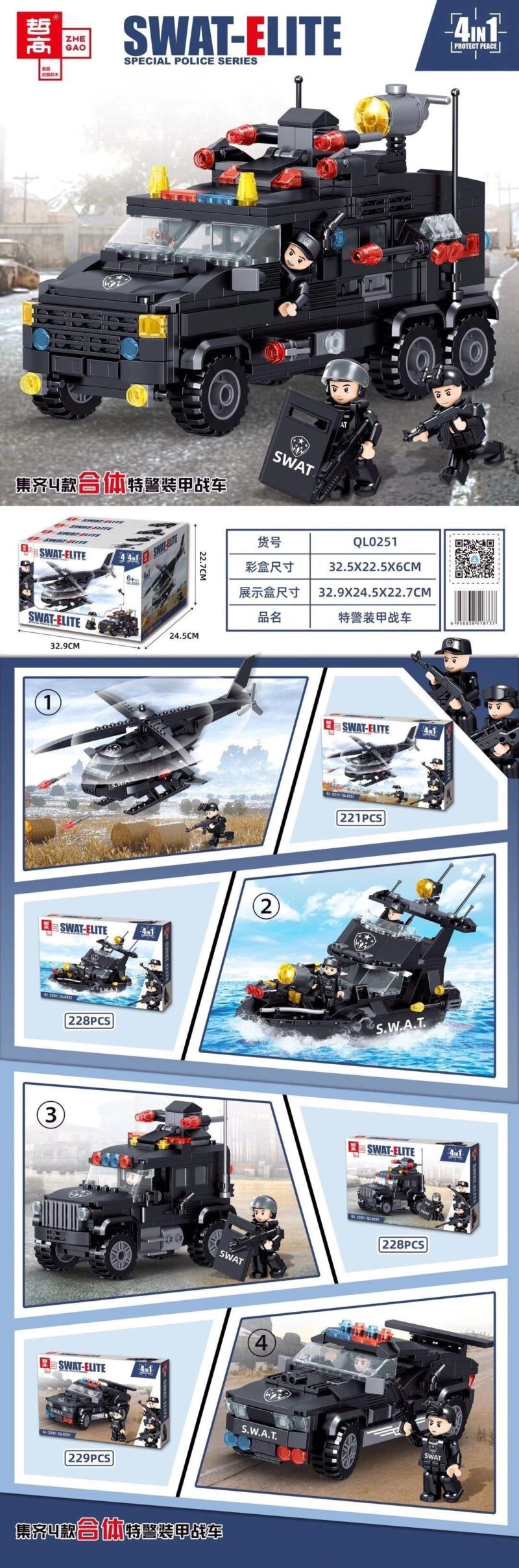 Bộ lắp ghép Zhegao QL0251 Xe Bọc Thép Đặc Nhiệm SWAT 4 Trong 1 (906 mảnh ghép) – Biến Hình Đa Năng và Lắp Được 4 Kiểu