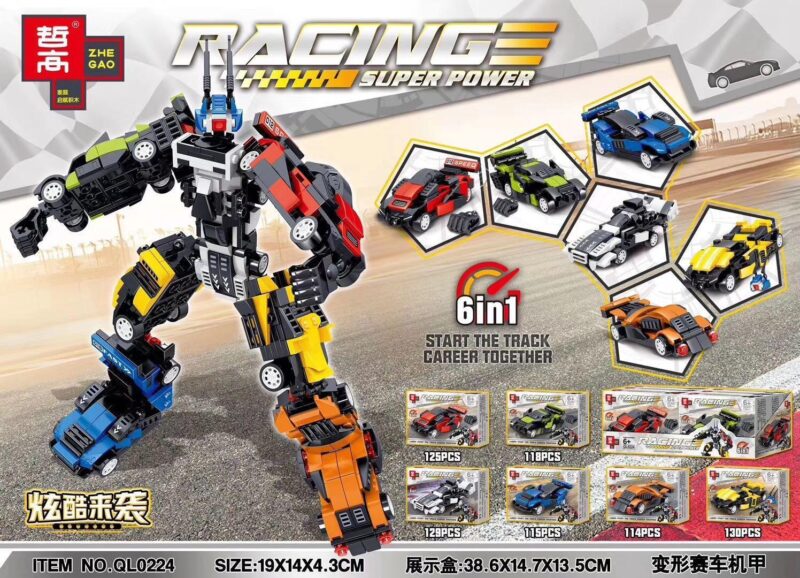 Bộ lắp ghép ZHEGAO QL0224 Racing Super Power cho phép bé lắp ráp thành 6 mẫu khác nhau, bao gồm 5 mẫu xe đua và 1 robot biến hình.