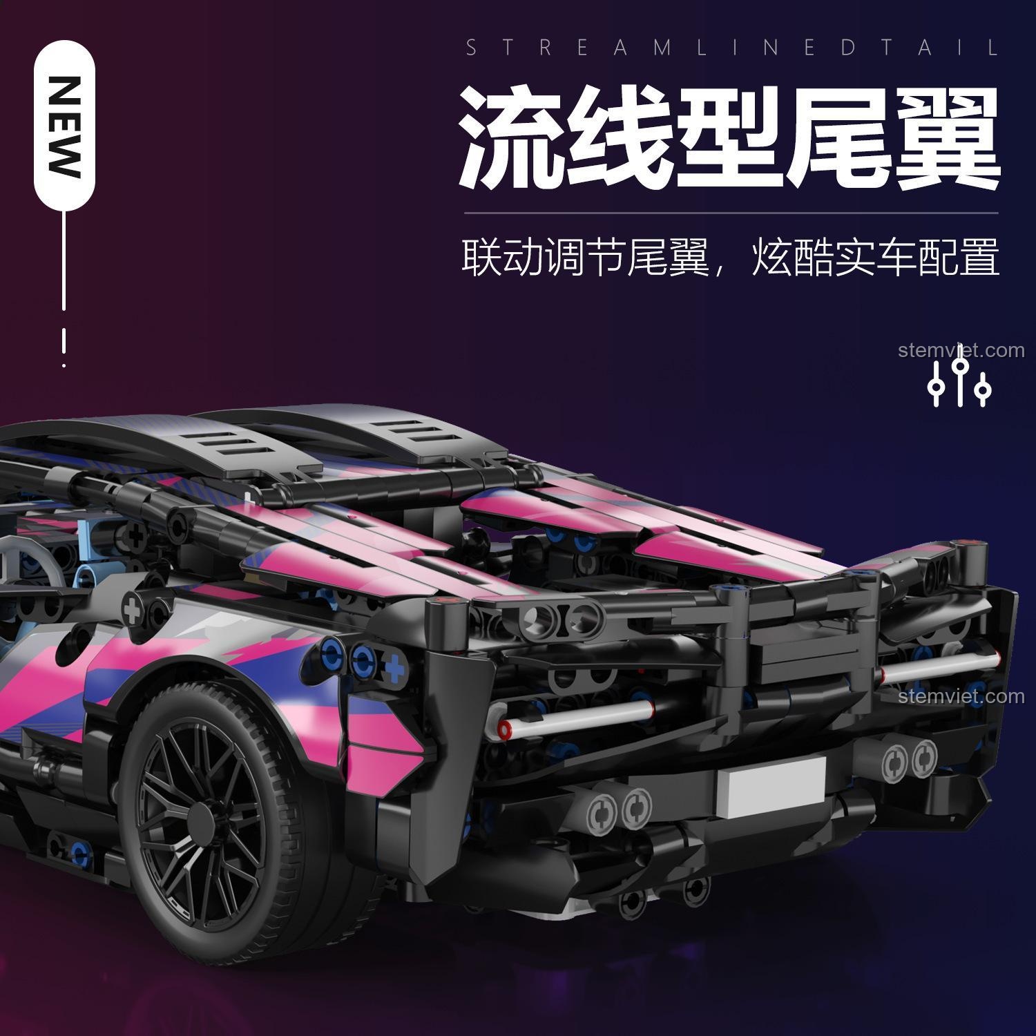 Điểm nhấn đặc biệt của bộ xếp hình MK6002 này là phần đuôi xe có thể điều chỉnh được, mô phỏng chân thực cơ chế hoạt động của siêu xe thật. Bên cạnh đó, hệ thống đèn LED ở phía trước xe không chỉ tăng thêm vẻ đẹp huyền ảo khi trưng bày trong bóng tối mà còn mang lại trải nghiệm chơi sống động hơn. Từng mảnh ghép được thiết kế tỉ mỉ, đảm bảo độ khớp nối hoàn hảo, giúp bé dễ dàng lắp ráp và tạo nên một tác phẩm nghệ thuật độc đáo. Đây là đồ chơi lắp ráp không thể thiếu cho những ai yêu thích siêu xe và phong cách Cyberpunk.