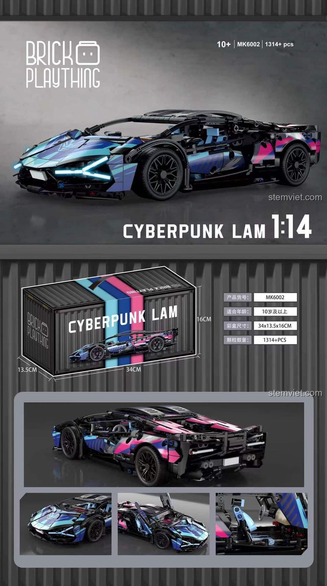 Bộ lắp ráp Brick Plaything MK6002 Mô hình Lamborghini Sián FKP 37 Cyberpunk là một minh chứng cho sự tinh xảo trong thiết kế. Với tỉ lệ 1:14, mô hình tái hiện chân thực từng đường nét khí động học của siêu xe Lamborghini Sián FKP 37, nhưng được phủ lên một lớp áo Cyberpunk đầy ấn tượng với các mảng màu đen, xanh dương và hồng rực rỡ. Kích thước mô hình sau khi hoàn thành là 36 cm chiều dài, 16.5 cm chiều rộng và 8 cm chiều cao, đủ lớn để trưng bày và đủ nhỏ để bé dễ dàng thao tác.