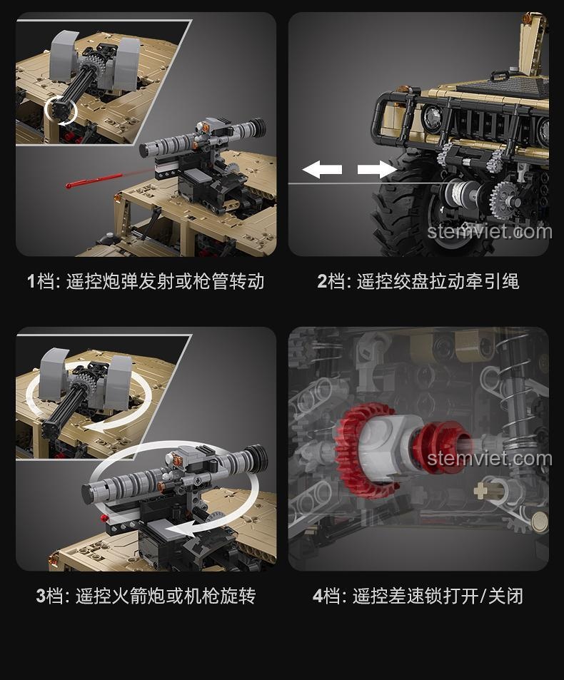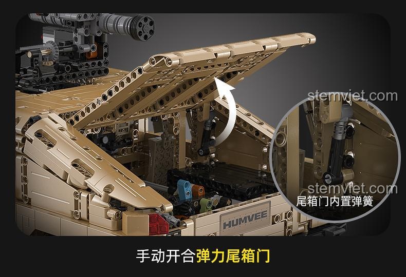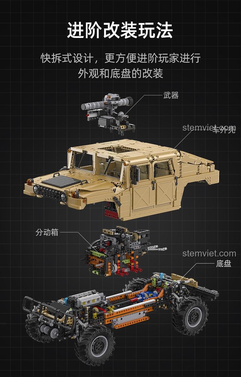 - Kịch bản 4: Nâng cấp và tùy chỉnh. Thử nghiệm các cấu hình vũ khí khác nhau, tháo lắp cản trước để thay đổi diện mạo, hoặc thậm chí tự thiết kế thêm các phụ kiện cho mô hình Humvee C61036 của bạn.