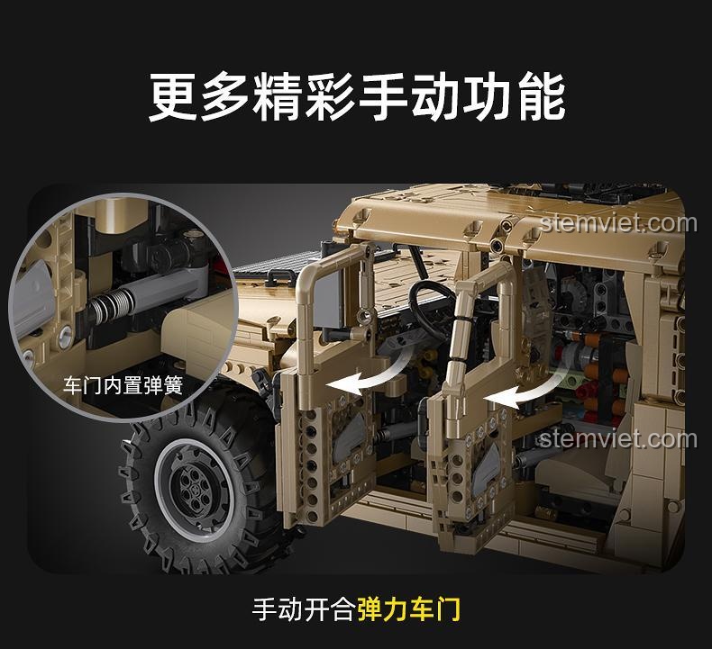 Bộ đồ chơi mô hình C61036 không chỉ gây ấn tượng bởi vẻ ngoài mạnh mẽ mà còn bởi hàng loạt tính năng cơ khí và tương tác độc đáo, mang đến trải nghiệm chơi vô cùng sống động. Điểm nổi bật đầu tiên là hệ thống treo độc lập 4 bánh với giảm xóc, giúp xe vận hành êm ái và ổn định trên mọi địa hình, mô phỏng chân thực khả năng vượt địa hình của chiếc Humvee thật. Hệ thống dẫn động 4 bánh (4×4) kết hợp với động cơ 8 xi lanh đối xứng ngang không chỉ tạo ra chuyển động mượt mà mà còn có thể liên kết với động cơ khi xe di chuyển, mang lại âm thanh và cảm giác chân thực. Một tính năng đặc biệt của đồ chơi xây dựng 61036 là khả năng chuyển đổi 4 chế độ chức năng thông qua một núm xoay tiện lợi ở phía sau xe. Bạn có thể điều khiển tháp pháo hoặc súng máy xoay 360 độ, bắn đạn (đối với pháo phản lực) hoặc xoay nòng súng (đối với súng máy), kích hoạt chức năng khóa vi sai để tăng cường khả năng leo dốc và thoát hiểm, hoặc sử dụng tời kéo phía trước để mô phỏng các hoạt động cứu hộ. Thiết kế module của xe, bao gồm khung gầm, hộp số và vỏ xe, cho phép tháo lắp dễ dàng, tạo điều kiện thuận lợi cho việc tùy chỉnh và nâng cấp. Cửa xe và cốp sau được trang bị lò xo, mang lại cảm giác mở đóng chân thực và chắc chắn. Đặc biệt, bộ đồ chơi này có thể dễ dàng nâng cấp lên phiên bản điều khiển từ xa bằng cách mua thêm các module động cơ và đèn LED, biến chiếc xe tĩnh thành một cỗ máy điều khiển linh hoạt với đèn pha tự động bật khi xe di chuyển. Đây là một mô hình CaDA C61036 Xe Humvee 1:8 với tính năng vượt trội, hứa hẹn những giờ phút giải trí không giới hạn.
