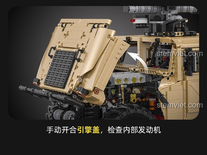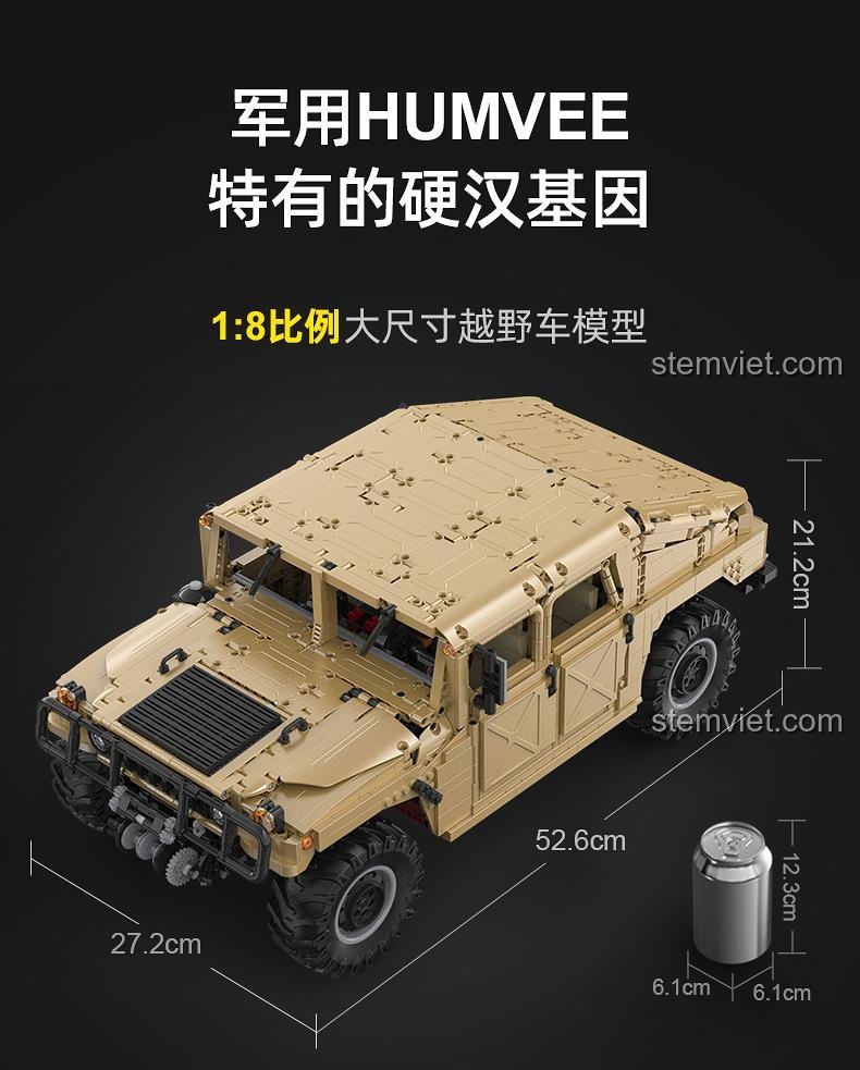 Bộ lắp ghép Xe địa hình Humvee CaDA C61036 không chỉ tái hiện chân thực hình ảnh chiếc Humvee H1 quân sự mà còn mang đến một trải nghiệm thị giác ấn tượng. Với tỉ lệ 1:8, mô hình này sở hữu kích thước ấn tượng: dài 52.6 cm, rộng 27.2 cm và cao 21.2 cm, đủ lớn để trưng bày và gây ấn tượng mạnh mẽ. Màu nâu chủ đạo của xe gợi lên hình ảnh những chiến dịch sa mạc đầy nắng gió, tăng thêm vẻ mạnh mẽ và chân thực. Từng chi tiết trên mô hình đều được chăm chút tỉ mỉ, từ lưới tản nhiệt cứng cáp, đèn pha sắc nét đến các đường nét góc cạnh đặc trưng của một chiếc xe quân sự. Bạn sẽ tìm thấy nội thất mô phỏng chân thực với vô lăng, bảng điều khiển, và cả cần gạt nước. Đặc biệt, nắp capo có thể mở ra để lộ động cơ 8 xi lanh đối xứng ngang được tái tạo một cách sống động, mang đến cái nhìn sâu sắc về cấu trúc bên trong của đồ chơi xây dựng Xe chiến đấu Humvee này. Đây chắc chắn là một tác phẩm nghệ thuật cơ khí mà bất kỳ người đam mê xe cộ và quân sự nào cũng muốn sở hữu.