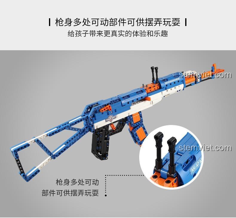 Ngoài ra, đồ chơi lắp ráp Mô hình súng AK-47 1001 còn có nhiều bộ phận có thể cử động linh hoạt, như cò súng, chốt an toàn, và hộp tiếp đạn (dù chỉ mang tính trang trí). Những chi tiết này không chỉ tăng tính chân thực cho mô hình mà còn giúp bé khám phá cơ chế hoạt động của một khẩu súng, từ đó phát triển tư duy kỹ thuật và sự hiểu biết về thế giới xung quanh. Đây là một món đồ chơi không chỉ để ngắm mà còn để trải nghiệm và tương tác.