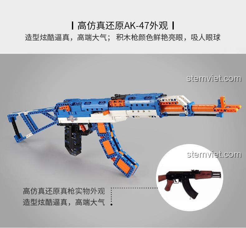 Đồ chơi lắp ráp Mô hình súng AK-47 này gây ấn tượng mạnh mẽ ngay từ cái nhìn đầu tiên với thiết kế mô phỏng chân thực đến từng chi tiết của khẩu súng trường tấn công AK-47 huyền thoại. Với chiều dài ấn tượng 73.6 cm, chiều rộng 5.6 cm và chiều cao 22.3 cm, mô hình này có kích thước gần như thật, mang lại cảm giác cầm nắm và trải nghiệm chân thực nhất cho bé. Các màu sắc chủ đạo như xanh dương, cam, trắng và đen được phối hợp hài hòa, tạo nên vẻ ngoài mạnh mẽ, hiện đại và cực kỳ thu hút.
