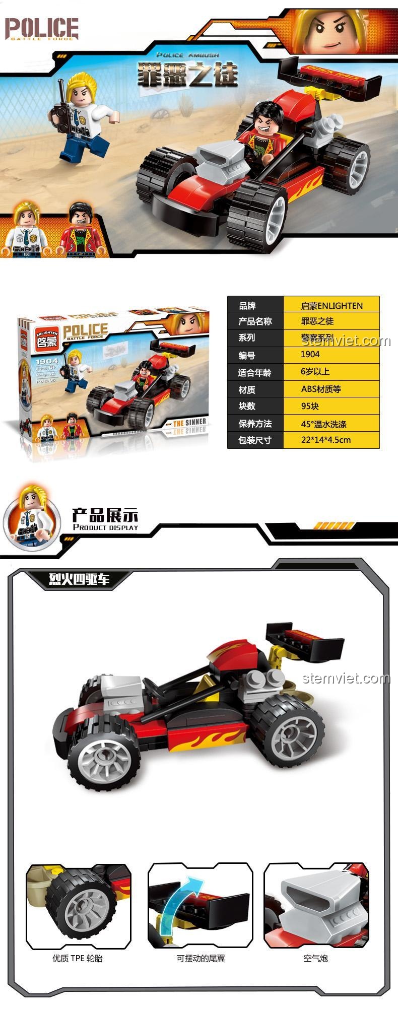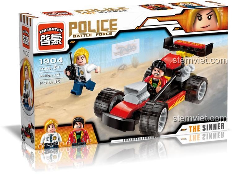 Bộ đồ chơi lắp ráp Enlighten 1904 Đội Cảnh Sát Chiến Đấu: Kẻ Tội Đồ gây ấn tượng mạnh mẽ với thiết kế xe đua cảnh sát và hai minifigure cực kỳ chi tiết. Chiếc xe đua được phối màu chủ đạo là Đỏ và Đen, điểm xuyết các chi tiết Trắng và Vàng, tạo nên vẻ ngoài mạnh mẽ và tốc độ. Dù không có thông số kích thước mô hình cụ thể, nhưng qua hình ảnh, bạn có thể thấy đây là một chiếc xe nhỏ gọn, phù hợp với bàn tay bé. Đặc biệt, thiết kế khí động học và cánh gió sau có thể điều chỉnh không chỉ tăng thêm tính chân thực mà còn khơi gợi sự tò mò về nguyên lý hoạt động của xe. Hai minifigure, một nữ cảnh sát dũng cảm và một kẻ tội đồ mưu trí, được khắc họa tỉ mỉ với trang phục và biểu cảm riêng biệt, sẵn sàng cho mọi tình huống. Bộ xếp hình 1904 này chắc chắn sẽ là điểm nhấn trong bộ sưu tập của bé, khuyến khích bé sáng tạo những câu chuyện và kịch bản độc đáo.