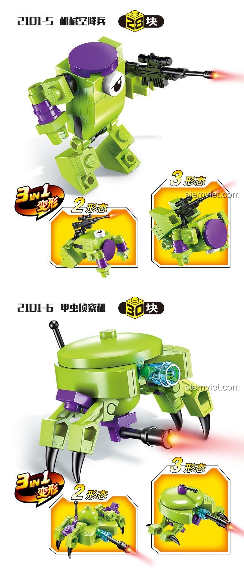 - Đại Chiến Robot Biến Hình: Bé có thể lắp ráp các robot lính dù và robot trinh sát, sau đó biến hình chúng thành các phương tiện chiến đấu để tham gia vào một trận chiến giả tưởng bảo vệ thành phố.