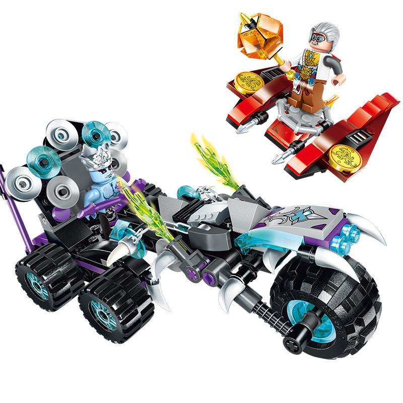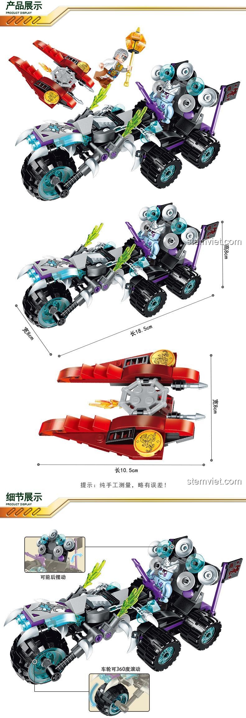 Điểm nhấn đặc biệt của bộ đồ chơi này chính là thiết kế độc đáo, lấy cảm hứng trực tiếp từ thế giới Phong Thần Diễn Nghĩa. Từng chi tiết, từ bộ khung xe hầm hố, bánh xe gai góc cho đến những lưỡi kiếm năng lượng màu xanh lá cây sắc bén, đều được chăm chút tỉ mỉ. Đặc biệt, bộ sản phẩm còn đi kèm một chiếc xe bay mini màu đỏ rực rỡ, bổ sung thêm khả năng chiến đấu linh hoạt cho các minifigures. Hai minifigures chiến binh với trang phục và vũ khí đặc trưng (như búa chiến và kiếm năng lượng) sẽ là linh hồn của mọi cuộc phiêu lưu, giúp bé thỏa sức sáng tạo các kịch bản chiến đấu hoành tráng.