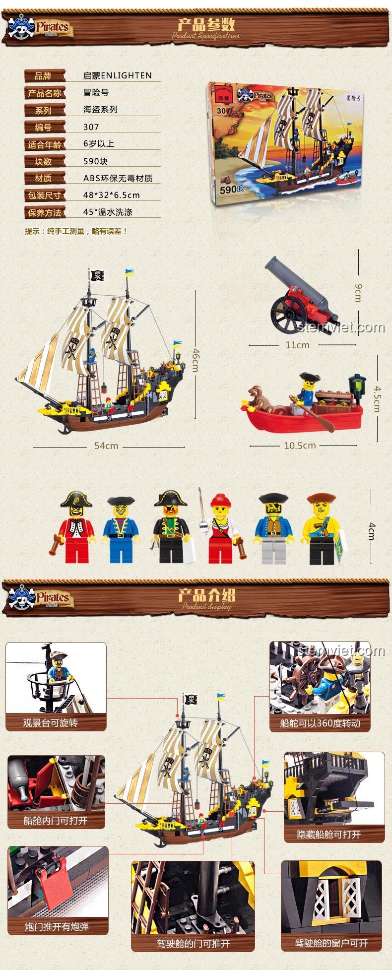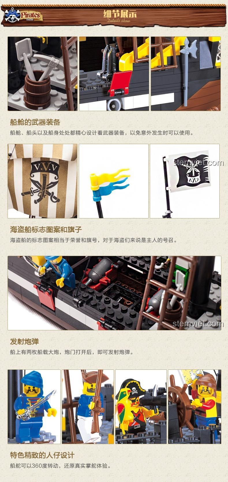 Mỗi chi tiết của đồ chơi xây dựng Tàu Cổ Điển ENLIGHTEN 307 đều được chăm chút tỉ mỉ, từ những cánh buồm sọc vàng trắng với biểu tượng đầu lâu xương chéo đặc trưng, đến những khẩu pháo uy nghi sẵn sàng khai hỏa. Con tàu còn được trang bị một chiếc thuyền nhỏ đi kèm, mở ra thêm nhiều kịch bản chơi và khám phá. Các minifigures hải tặc với trang phục và vũ khí đa dạng như kiếm, súng lục và mũ hải tặc, càng làm tăng thêm tính chân thực và hấp dẫn cho mô hình.