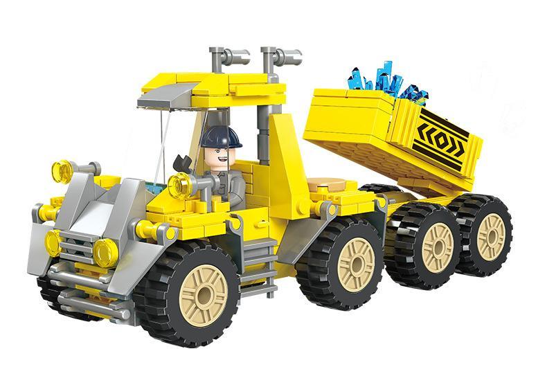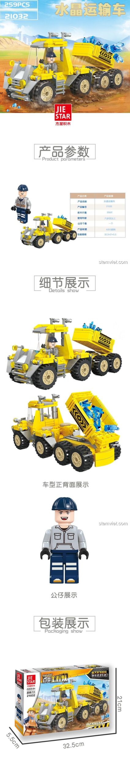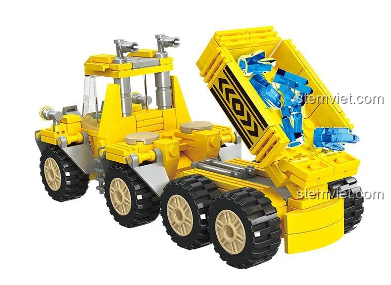 Ngoài ra, bộ đồ chơi mô hình 032 này còn đi kèm với các khối "pha lê" màu xanh trong suốt, tượng trưng cho khoáng sản. Bé có thể chất đầy "khoáng sản" vào thùng xe, vận chuyển chúng đến "công trường" và sau đó nâng thùng để đổ ra. Quá trình này không chỉ mang lại niềm vui mà còn giúp bé phát triển kỹ năng phối hợp tay mắt, tư duy không gian và khả năng giải quyết vấn đề khi thực hiện các nhiệm vụ vận chuyển. Đây là một món đồ chơi xây dựng JIESTAR thực sự sống động và đầy thử thách!