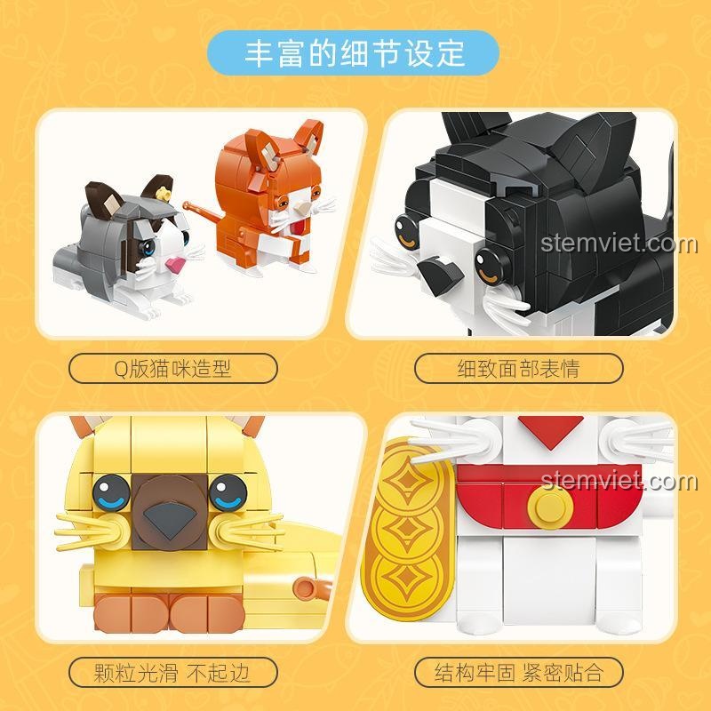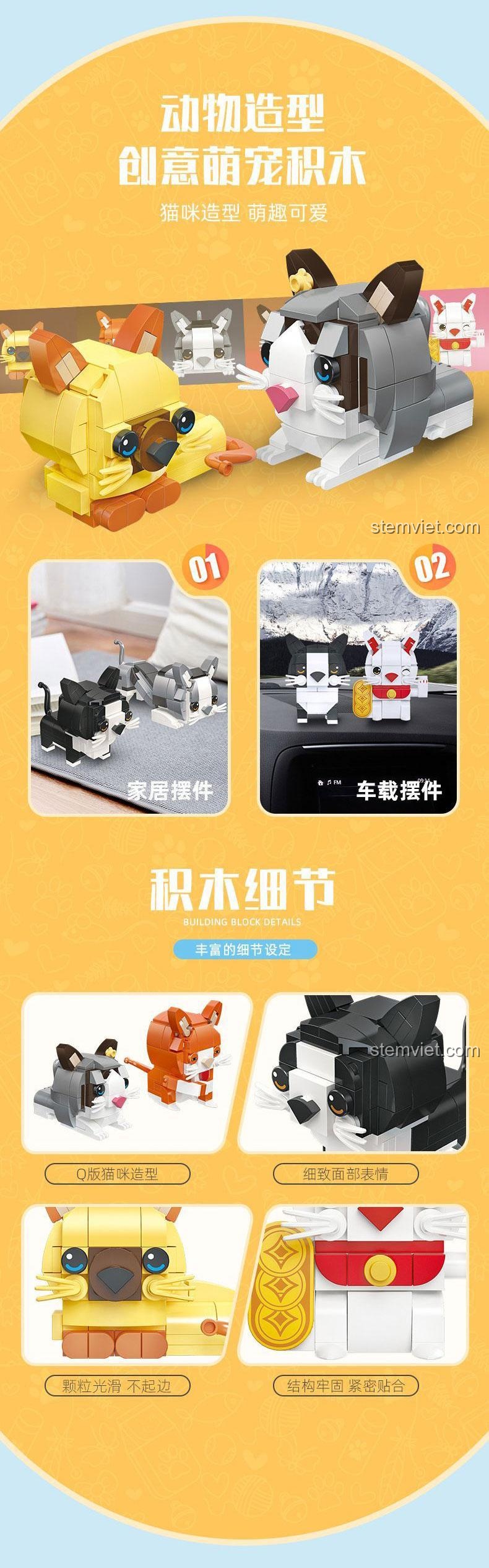 Những chú mèo đã từ lâu trở thành người bạn thân thiết của con người, mang đến sự ấm áp và niềm vui. Bộ lắp ghép JIESTAR 58109 lấy cảm hứng từ những giống mèo phổ biến và đáng yêu nhất, tái hiện chúng dưới dạng đồ chơi mô hình sống động. Đặc biệt, trong bộ sưu tập này còn có sự xuất hiện của Mèo Thần Tài (Maneki-Neko) – biểu tượng may mắn và thịnh vượng trong văn hóa Á Đông. Việc lắp ráp đồ chơi lắp ráp Mèo cưng này không chỉ giúp bé hiểu hơn về các loài vật mà còn khơi gợi trí tò mò về văn hóa, lịch sử. Mẹ bé gái 6 tuổi sẽ rất vui khi thấy con mình vừa chơi vừa học, khám phá những điều thú vị về thế giới xung quanh qua từng mảnh ghép.