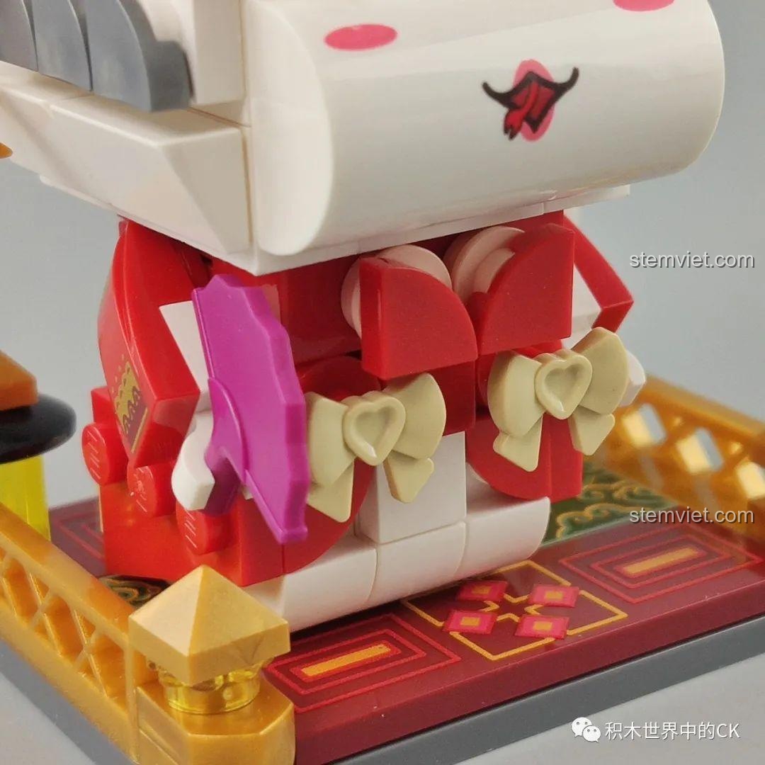 Thỏ Zodiac đồ chơi xếp hình K10134 nổi bật với thiết kế BrickHeadz độc đáo, mang phong cách linh vật Thỏ Ngọc Thợ Thêu truyền thống. Các chi tiết trên mô hình đều được in ấn trực tiếp lên mảnh ghép, không phải dán sticker, giúp tăng độ bền và tính thẩm mỹ. Mô hình còn đi kèm các phụ kiện nhỏ xinh như khung thêu, tạo thêm điểm nhấn và khơi gợi trí tưởng tượng cho bé.