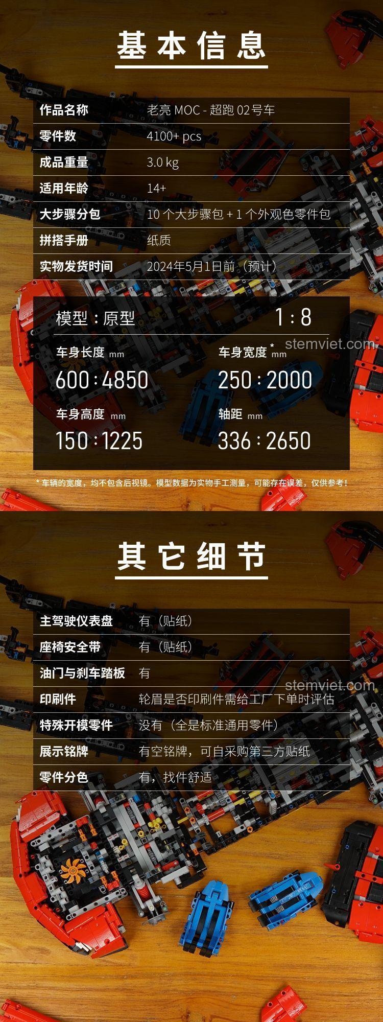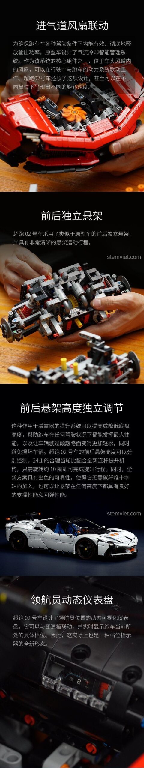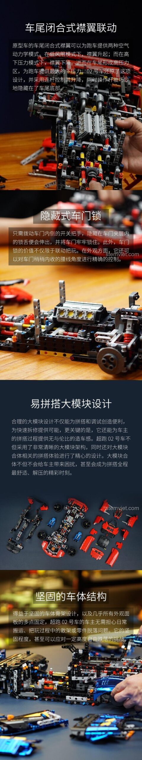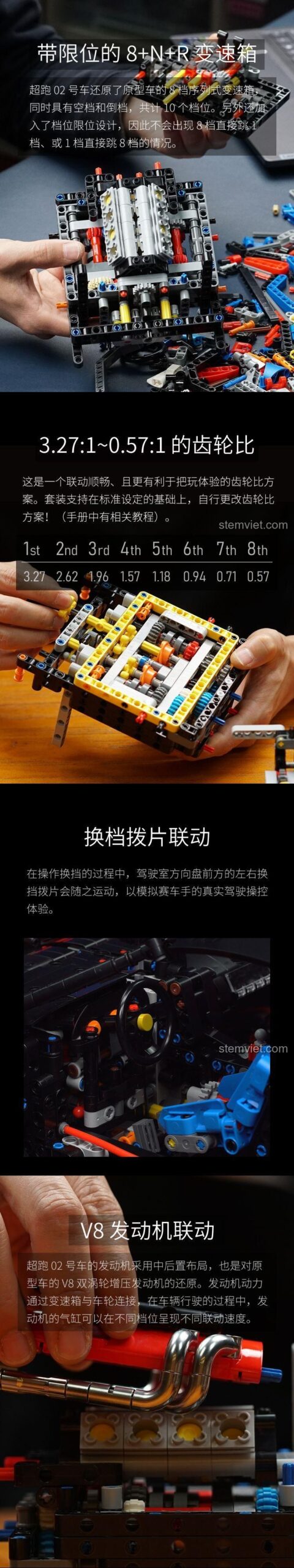 Bộ xếp hình 02 này nổi bật với hộp số 8+N+R có giới hạn, hệ thống treo độc lập trước sau, điều chỉnh độ cao gầm xe, cánh gió sau chủ động, động cơ V8 có piston chuyển động, bảng điều khiển động và khóa cửa ẩn. Tất cả đều được thiết kế để mang lại trải nghiệm chân thực và khám phá kỹ thuật.
