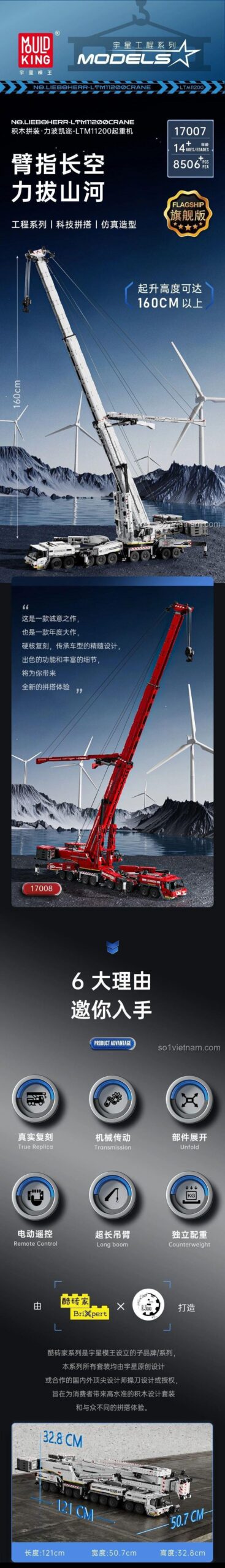 Kích thước mô hình cần cẩu Liebherr LTM 11200 17008 sau khi hoàn thành là 121cm chiều dài, 50.7cm chiều rộng và 32.8cm chiều cao, tạo nên một mô hình khổng lồ và ấn tượng. Bạn sẽ được chiêm ngưỡng một bộ lắp ráp Cần cẩu di động Liebherr với cần cẩu siêu dài, hệ thống đối trọng cân bằng và truyền động cơ khí phức tạp, tất cả đều được mô phỏng một cách tinh xảo. Ngay cả những chi tiết nhỏ nhất như cabin điều khiển, hệ thống bánh xe đa trục hay các trụ chống đỡ đều được tái hiện đầy đủ, mang đến một mô hình sống động như thật. Đồ chơi lắp ghép 17007 (phiên bản màu trắng) cũng có thiết kế tương tự, cho thấy sự đồng nhất trong chất lượng và độ chi tiết của dòng sản phẩm này.