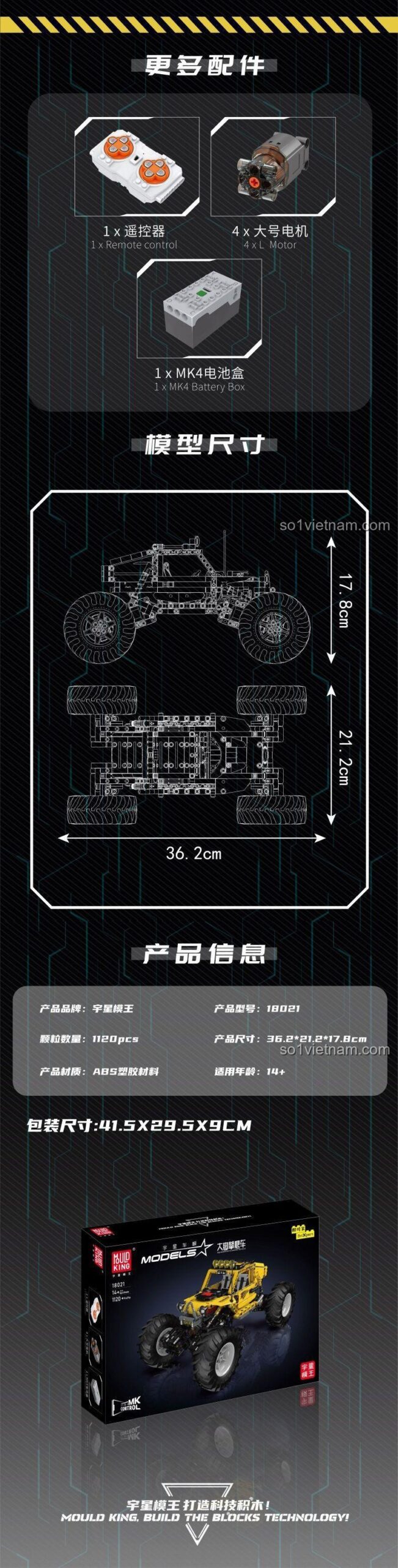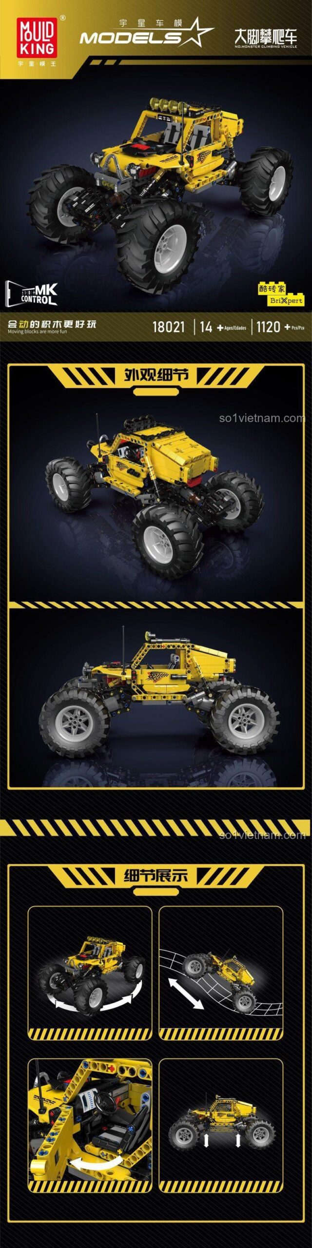 Ngay từ cái nhìn đầu tiên, đồ chơi mô hình Mould King 18021 đã gây ấn tượng mạnh mẽ với thiết kế hầm hố và màu sắc chủ đạo là vàng rực rỡ kết hợp với các chi tiết đen mạnh mẽ. Chiếc xe địa hình này sở hữu một vẻ ngoài cực kỳ năng động và sẵn sàng cho mọi cuộc chinh phục. Với kích thước mô hình ấn tượng: dài 36.2 cm, rộng 21.2 cm và cao 17.8 cm, chiếc xe không chỉ là một món đồ chơi mà còn là một tác phẩm trưng bày đầy tự hào.